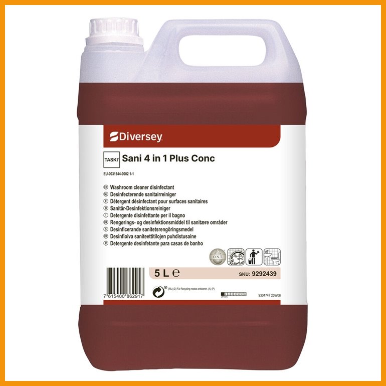 Taski Sani 4 in 1 Plus Conc on yhdistetty puhdistus-, kalkinpoisto-, desinfiointi- ja hajunpoistoaine pesutilojen kaikille haponkestäville koville pinnoille. Aine tehoaa sekä bakteereihin, hiivoihin että ympäröityihin viruksiin ja toimii kaikenkovuisissa vesissä. Samalla se puhdistaa, poistaa kalkin ja neutraloi pahat hajut O.N.T. -teknologian avulla ja jättää niiden tilalle raikkaan tuoksun.Pakkauskoko: 5 litraa.