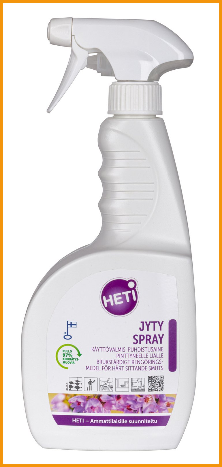 HETI Jyty Spray on käyttövalmis puhdistusaine vaikean ja pinttyneen lian poistamiseen kaikilta kovilta pinnoilta. Tuote poistaa tehokkaasti kiinnittynyttäkin rasva- ja nokilikaa. Ei vaadi erillistä huuhtelua.Kotimaisella tuotteella on Avainlippu-tunnus.