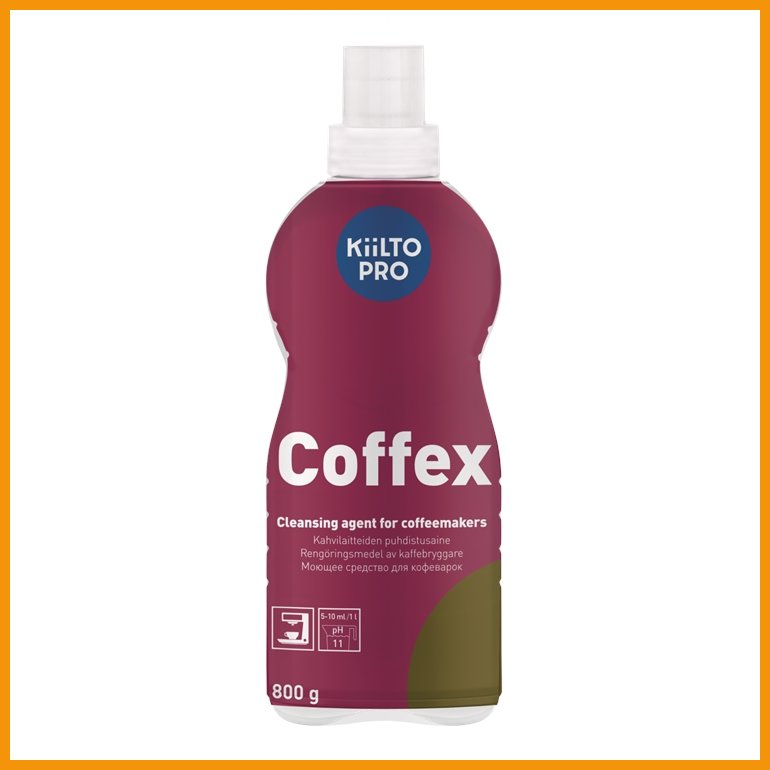 Kiilto Pro Coffex on kahvi-, tee- ja maitolikaa poistava kahvi-ja teelaitteiden puhdistusaine. Hajustamaton, pölyämätön ja väriaineeton jauhe liukenee helposti, valkaisee ja irrottaa likaa tehokkaasti.Käyttökohteita: kahvinkeittimien kahvisäiliöt, teekeittimet, lasikannut, termoskannut, kahvipinttymät,espressokeittimet ja gruppokahvat.
