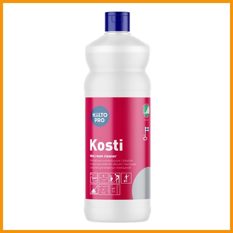Kiilto Pro Kosti on emäksinen märkätilojen puhdistusaine koneellisiin menetelmiin ja vaahdotuslaitteisiin. Aine poistaa tehokkaasti sekä orgaanista että synteettistä rasvalikaa ja soveltuu käytettäväksi sekä Variomatic-vaahdotuslaitteen että Kiiltojet-suihkupuhdistuslaitteen kanssa.Kotimaisella tuotteella on Avainlippu-tunnus ja pohjoismainen Joutsenmerkki.
