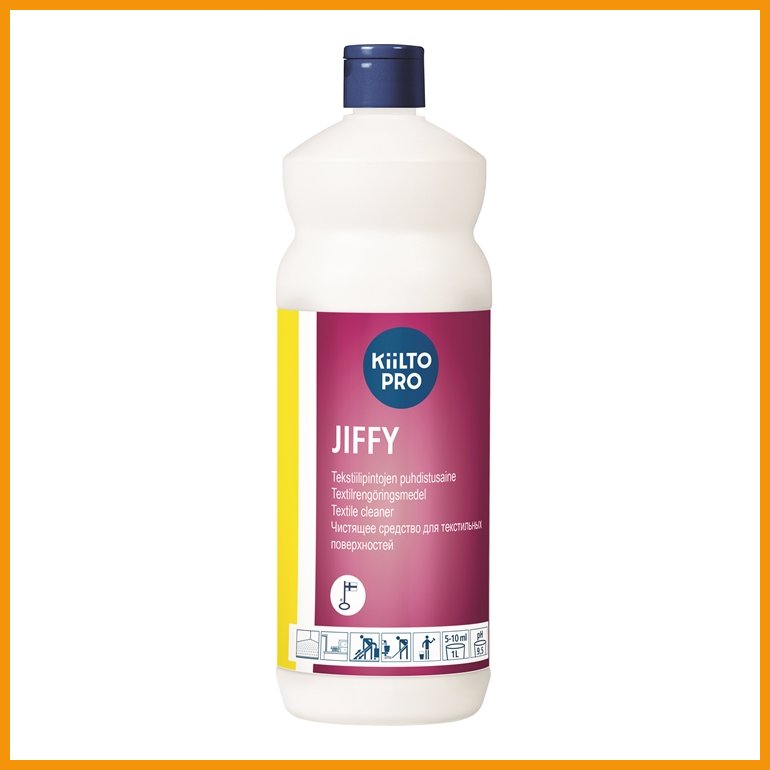 Kiilto Pro Jiffy on hajustamaton ja heikosti emäksinen tekstiilipintojen puhdistusaine, joka soveltuu myös tahranpoistoon ja kovien pintojen, kuten kalusteiden puhdistukseen. Tuote on erinomainen tekstiilipintojen tahranpoistoon ja pesuun yhdessä Hybrid LW46 Dual Coren ja painehuuhtelukoneen tai harjaavan yhdistelmäkoneen kanssa.Pakkauskoko: 1 litra