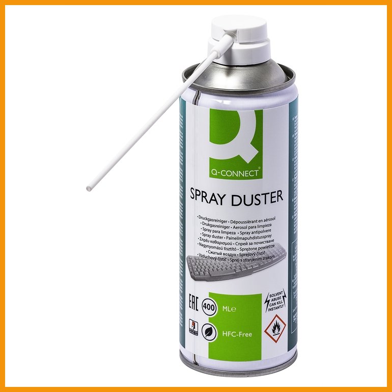 Q-Connectin paineilmalla toimiva puhdistussuihke puhaltaa puhtaaksi vaikeapääsyiset ja kosketukselle herkätkin pinnat, kuten näppäimistön välit, hiirten näppäinten aluset. kamerat ja printterit. Myös esimerkiksi pöytätietokoneen kotelon sisäosien puhdistaminen pölystä pidentää huomattavasti tietokoneen käyttöikää, parantaa toimintavarmuutta ja vähentää sähkönkulutusta.