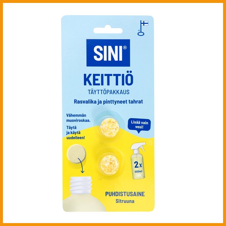Sini Keittiö on täyttöpakkaus samannimiseen kestopulloon, jolla pääset eroon pesuaineiden kertakäyttöisistä muovipulloista. Tiputtamalla tabletin vedellä täytettyyn pulloon saat pullollisen keittiön puhdistusainetta.pH: 9