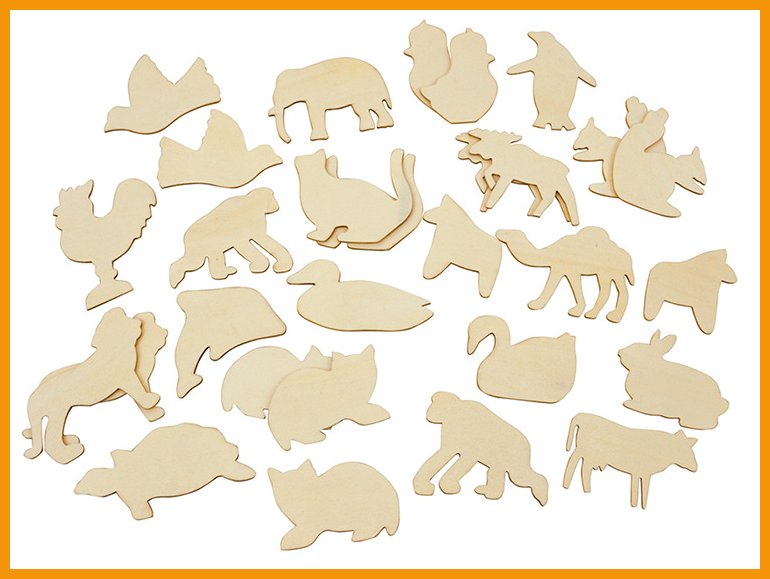Käsittelemättömästä vanerista leikatut eläinhahmot soveltuvat monenlaiseen askarteluun. Hahmot on helppo esimerkiksi maalata tai ja liimata kortteihin, tai niistä voi tehdä vaikkapa kaulakoruja poraamalla ripustusreiän.Pussissa on 30 kpl.
