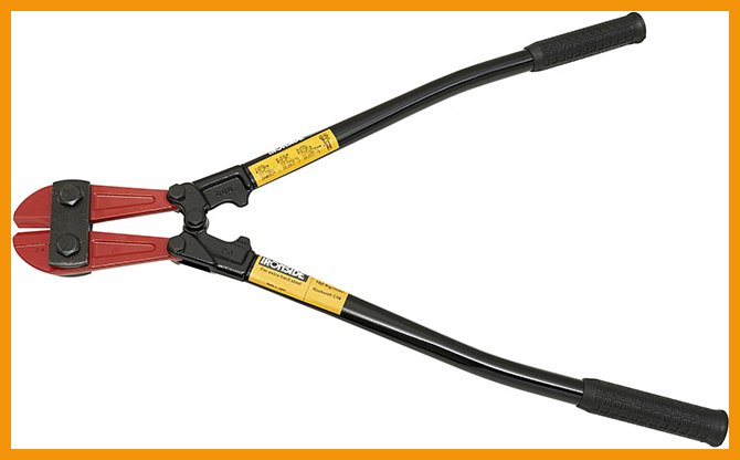 Karkaistuilla leikkuupinnoilla ja voimanivelellä varustetut voimapihdit/pulttisakset. Kädensijoissa on muoviset otepinnat.