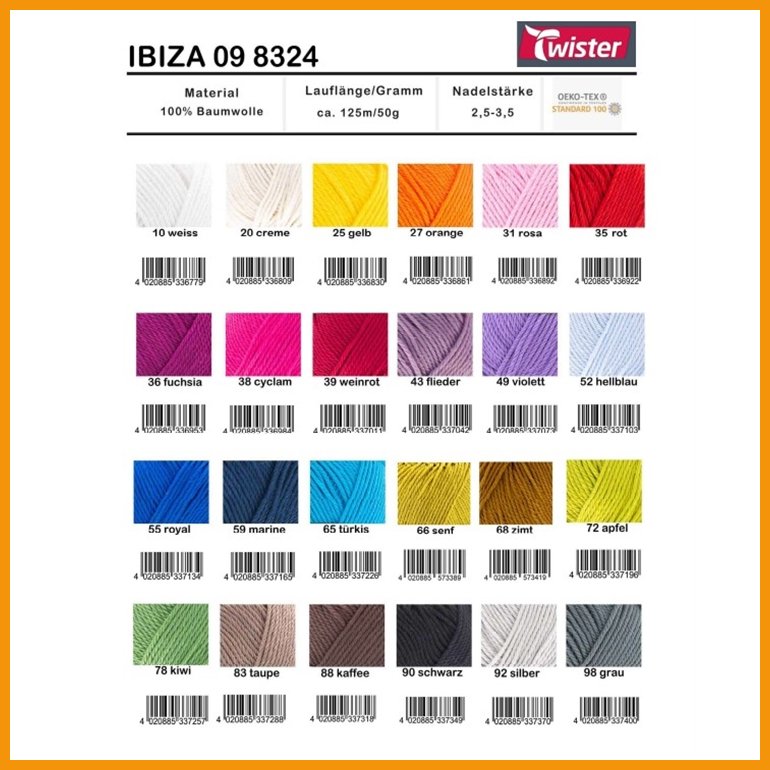 Puuvillalanka Ibiza on 100% merseroidusta puuvillasta valmistettu monikäyttöinen lanka joka sopii neulomiseen, virkkaamiseen ja askarteluun. Puikko- ja virkkuukoukkusuositus 2,5-3,5 mm. 50 g = noin 125 m. Öko-Tex-standardi 100 sertifikaatti.Puuvillalanka Ibiza 50 g musta on hyvälaatuinen toimistotarvike, jonka verkkokaupan tilauksen toimitus kestää 1-2 päivää. Tiedäthän, että Toimitus on ilmainen kaikilla verkkokaupan ostoksilla, joiden hinta on yli 140 €. Meiltä voit tilata laskulla ja ilman rekisteröitymistä.