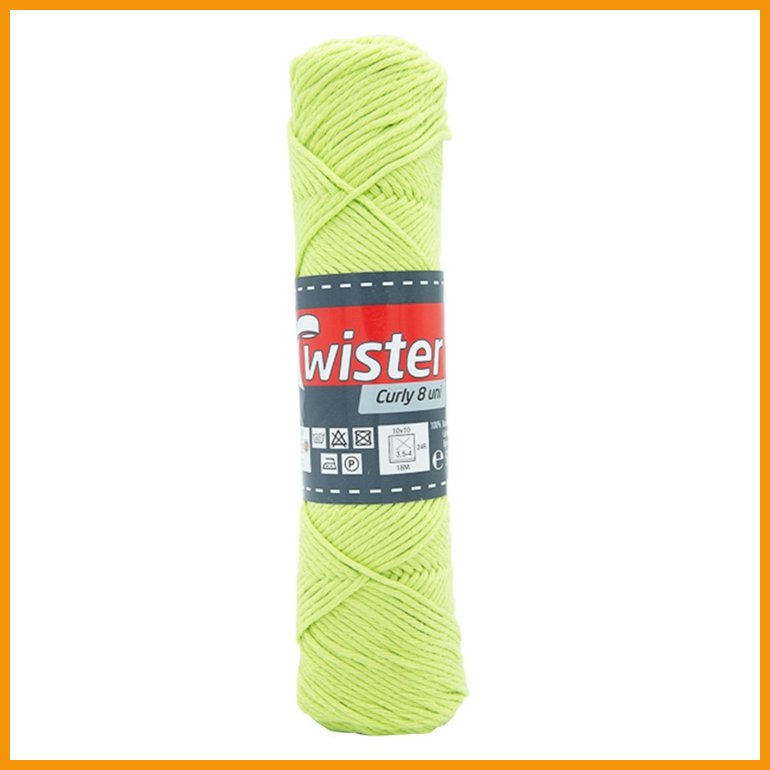 Twister Curly 8 on pehmeä, merseroimaton puuvillalanka virkkaukseen ja neulomiseen. Monikäyttöinen lanka sopii sekä vaatteisiin ja asusteisiin että erityisesti kodintarvikkeisiin, kuten pannunalusiin, patalappuihin, kasseihin, pesulappuihin ja säilyttimiin. Lanka kestää 60 °C konepesun.Pakkauskoko: 50 g = 85 m
