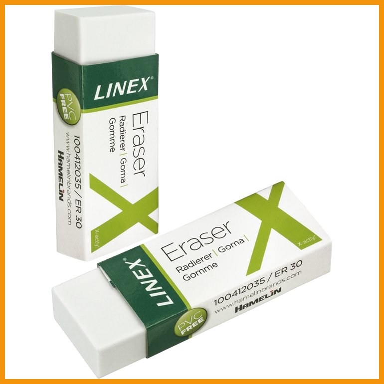 Linex ER30 on paperille ja piirustusmuoville soveltuva pyyhekumi, joka ei jätä pyyhkimisjälkiä. Tuote ei sisällä luonnonkumia tai PVC:tä.Mitat: 62 x 20 x 11 mm