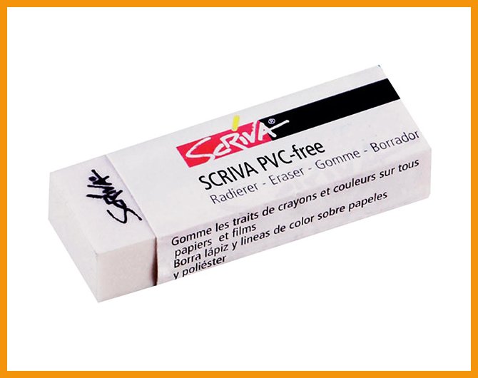 Scrivan PVC-vapaa ja pölyämätön pyyhekumi soveltuu sekä sekä lyijy- että värikynille ja niin tavalliselle paperille, kuultopaperille kuin piirustusmuovillekin. Kumin ympärillä on kartonkinen suojakääre. Ei sisällä luonnonkumia tai flataatteja.Mitat: 65 x 23 x 13 mm