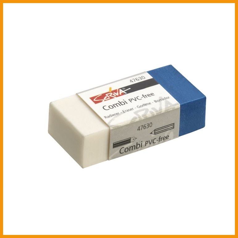 Kaksivärisen Scriva Combi -pyyhekumin valkoinen puoli pyyhkii lyijy- ja värikynien jäljen ja sininen puoli jopa musteen. Kumi soveltuu niin tavalliselle piirustuspaperille, kuultopaperille kuin piirustusmuovillekin. PVC-vapaa ja pölyämätön kumi ei sisällä ftalaattia eikä lateksia.Mitat: 41 x 19 x 11,5 mm
