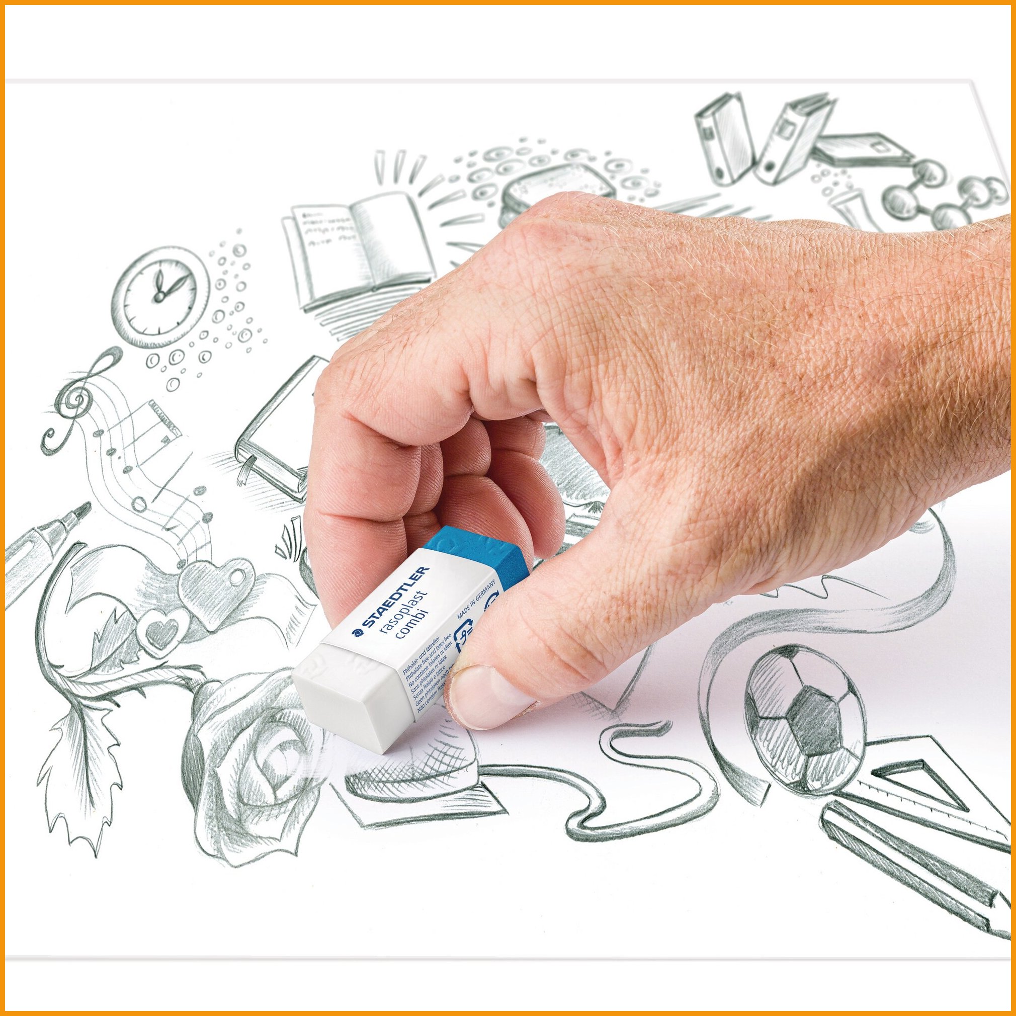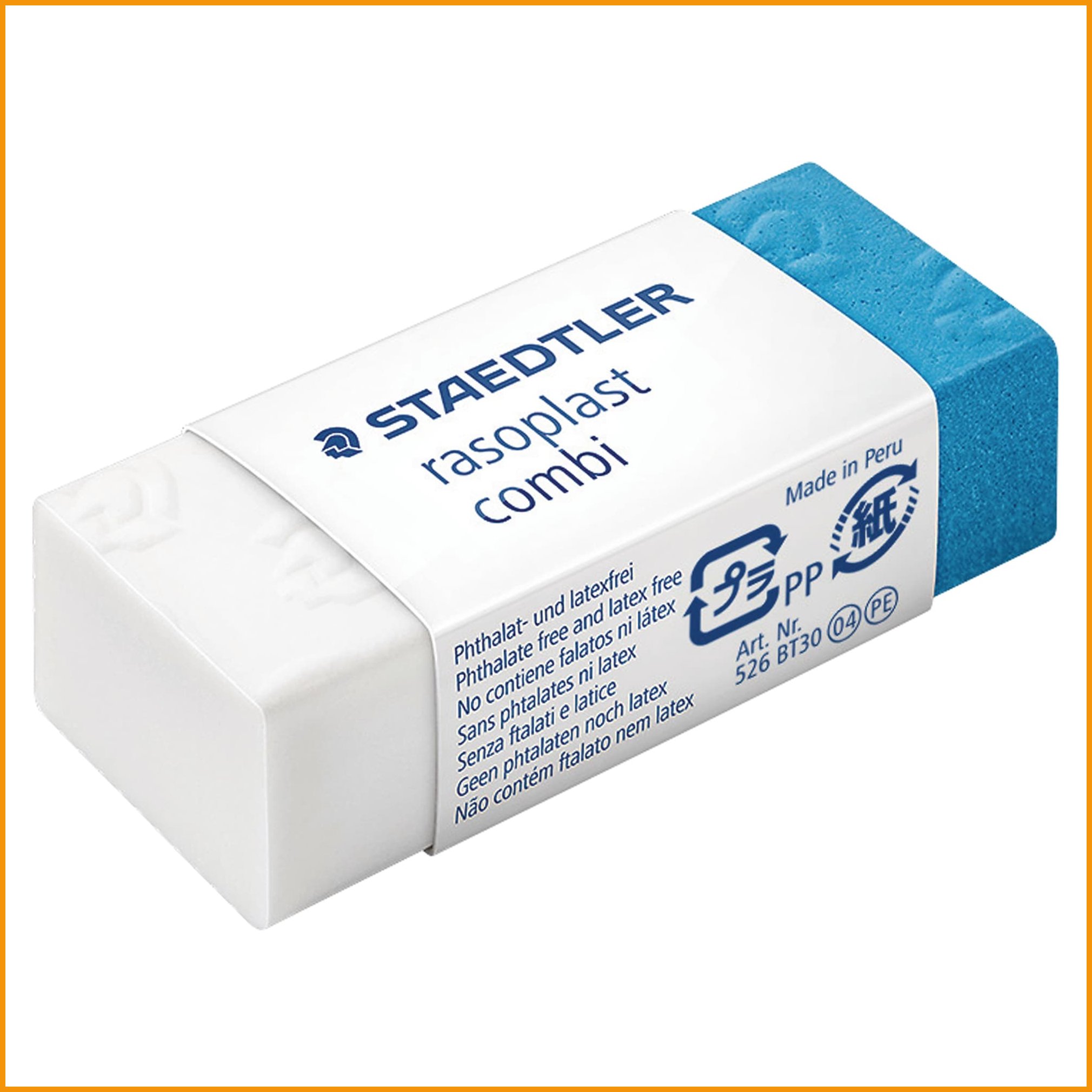 Pyyhekumi Staedtler rasoplast combi 526 bt on pyyhekumi kuulakärkikynälle, lyijykynälle ja värikynnälle. Pyyhekumin sininen pää on tarkoitettu mustekynälle. Pyyhekumissa on käyttö helpottava pahvinen suojakotelo, joka pitää sen puhtaana ja aina käyttövalmiina.