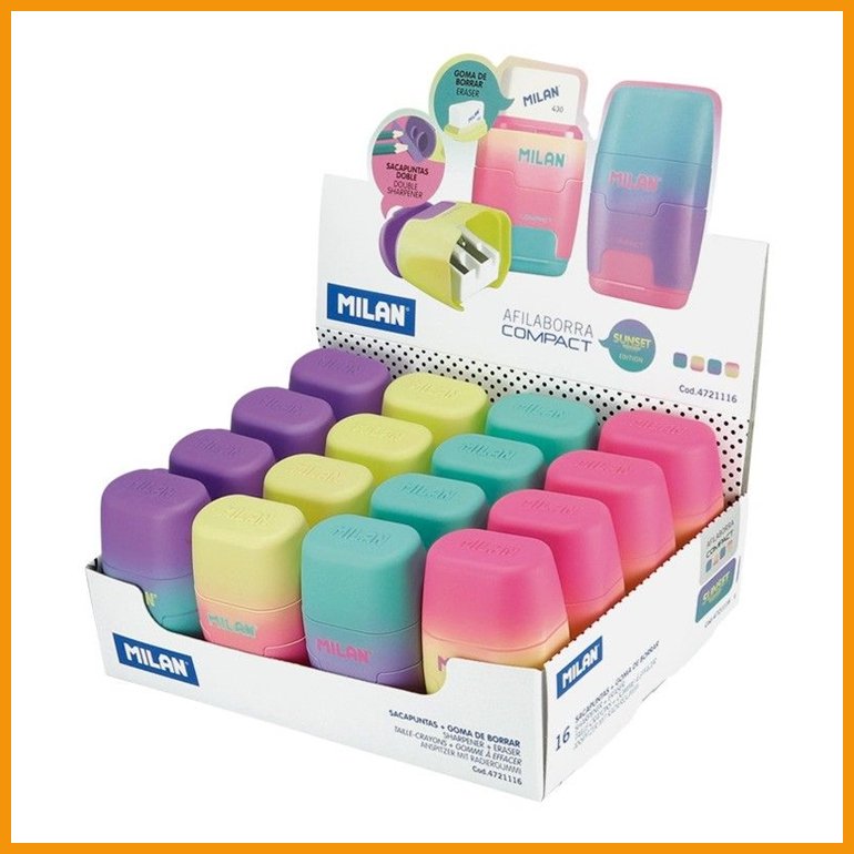 Milan Compact Sunset yhdistää kaksiteräisen teroittimen ja pyyhekumin yhdeksi käteväksi kokonaisuudeksi, jolla pyyhit ja teroitat niin lyijy- kuin värikynätkin. Sekä kumi että teroitin pysyvät puhtaina suojakorkin takana. Yksi teroitinaukko normaalikokoisille ja toinen paksuille kynille. Tuote ei sisällä luonnonkumia.Esillepanopakkauksessa on 16 tuotteen värilajitelma.