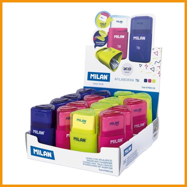 Kolmionmallinen Milan TRI Acid yhdistää teroittimen ja pyyhekumin yhdeksi käteväksi kokonaisuudeksi, jolla pyyhit ja teroitat niin lyijy- kuin värikynätkin. Sekä kumi että teroitin pysyvät puhtaina suojakorkin takana. Tuote ei sisällä luonnonkumia.Esillepanopakkauksessa on 16 tuotteen värilajitelma.