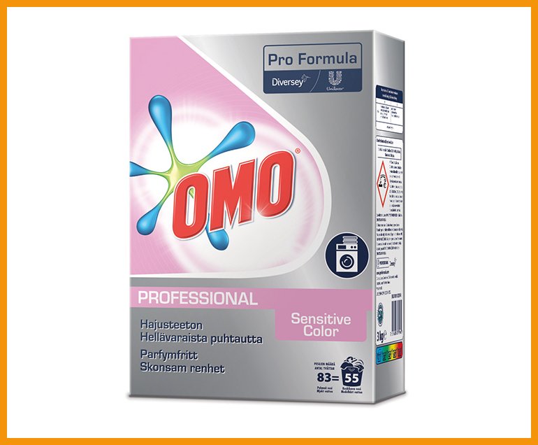 Omo Pro Formula Sensitive Color on hajusteeton, tiivistetty pyykinpesujauhe, joka soveltuu tummien ja värillisten tekstiilien sekä mikrokuituisten siivoustekstiilien pesuun. Emäksinen, värejä säästävä koostumus poistaa tehokkaasti rasva- ja öljylikaa sekä veri- ja ruokatahroja. Tuote sopii myös vaikeiden tahrojen poistoon, pyykin esipesuun ja tarvittaessa liotukseen. Ei sisällä fosfaattia, zeoliittia, väriaineita tai optisia kirkasteita.Tuotteella on pohjoismainen Joutsenmerkki.