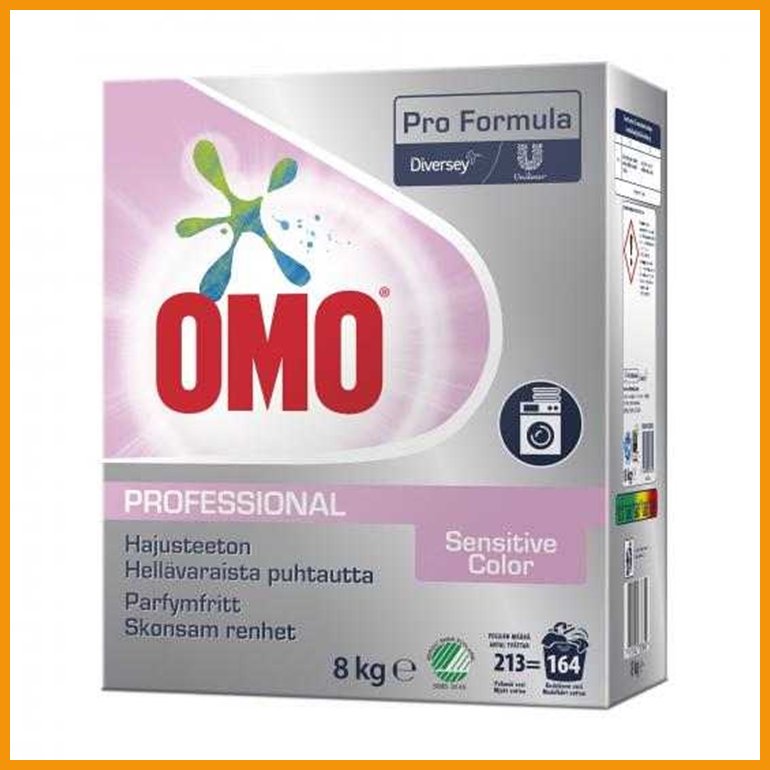 Omo Pro Formula Sensitive Color on hajusteeton, tiivistetty pyykinpesujauhe, joka soveltuu tummien ja värillisten tekstiilien sekä mikrokuituisten siivoustekstiilien pesuun. Emäksinen, värejä säästävä koostumus poistaa tehokkaasti rasva- ja öljylikaa sekä veri- ja ruokatahroja. Tuote sopii myös vaikeiden tahrojen poistoon, pyykin esipesuun ja tarvittaessa liotukseen. Ei sisällä fosfaattia, zeoliittia, väriaineita tai optisia kirkasteita.Tuotteella on pohjoismainen Joutsenmerkki.