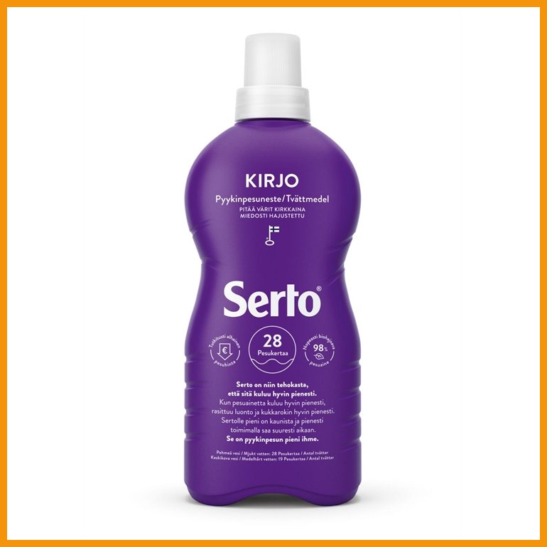 Serto Kirjo on erityisesti värillisen pyykin pesuun suunniteltu pyykinpesuneste, joka saavuttaa ihanteellisen pesutuloksen alhaisissakin pesulämpötiloissa ja puhdistaa tehokkaasti. Pyykinpesunesteen värisuoja suojaa tekstiilien värejä pesussa ja pitää ne kirkkaina. Ei sovellu villalle ja silkille.Kotimaisella tuotteella on Avainlippu-tunnus.