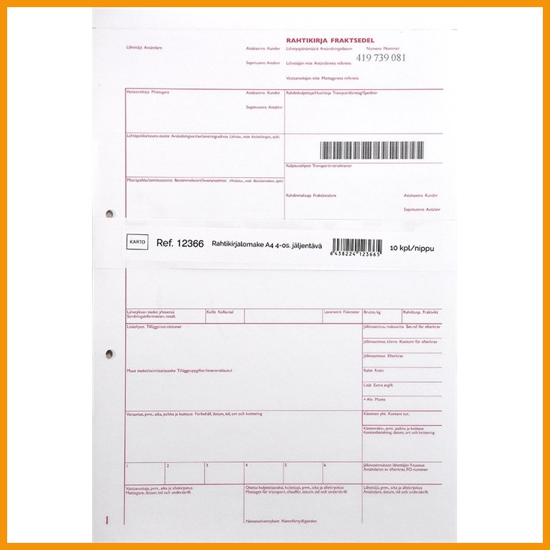 Neliosainen, käsinkirjoitukseen tarkoitettu rahtikirjalomake juoksevalla numerosarjalla ja jatkolomakkella. Lomakkeessa on rei'itys 8 cm välein.Kotimaisella tuotteella on Avainlippu-tunnus.