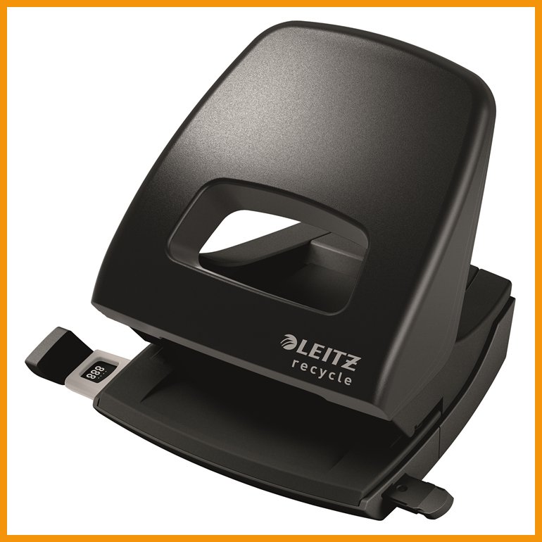 Leitz NeXXt Recycle -lävistäjä on valmistettu 45-prosenttisesti kulutusjätteestä ja kierrätysmuovista. Se on myös 100-prosenttisesti kierrätettävissä, sillä osat saa purettua toisistaan. Lävistäjässä on patentoitu käsituki ja terävät terät, jotka yhdessä vähentävät lävistysvoiman tarvetta. Selkeät kokomerkinnät ja vahva paperinohjain varmistavat arkin optimaalisen sijoittumisen, ja saranoitu roska-astia on helppo tyhjentää.Väri: musta