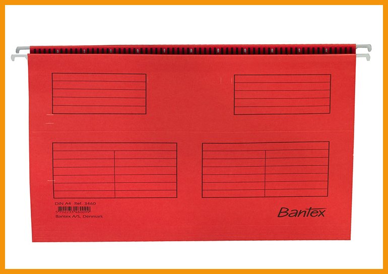 Bantex-riippukansion etupuolella on valmiiksi painetut kirjoitusalueet merkinnän ja arkistoinnin helpottamiseksi. Orsi on valmistettu muovipinnoitetusta teräksestä, joka liukuu vaivattomasti ja äänettömästi. Itse kansio on Blue Angel -ympäristösertifioitua, kierrätettyä ja happovapaata kartonkia. Pakkauksessa on mukana myös etiketit ja kirkkaat etiketinpidikkeet.Koko: A4