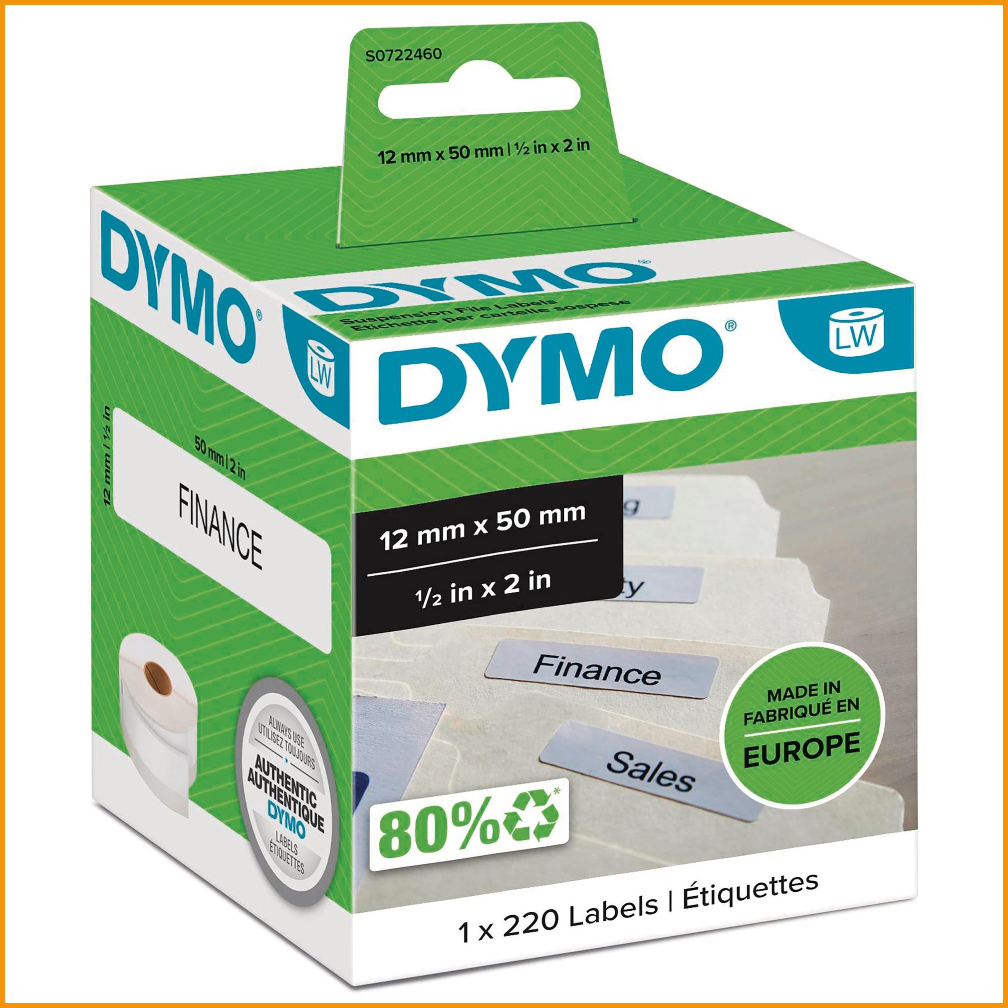 Dymo lw -riippukansiotarrat sopivat kansioiden lisäksi moniin muihin käyttökohteisiin. paperiset, pysyvällä liimalla varustetut tarrarullat ovat yhteensopivia dymo labelwriter -tarratulostimien kanssa. lämpötulostustekniikan ansiosta mustetta tai väriainetta ei tarvita.