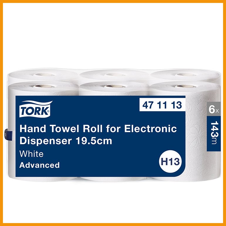 Tork H12 on Advanced-laatuinen, miellyttävästi kohokuvioitu rullakäsipyyhe elektroniseen annostelijaan. Riittoisa rulla soveltuu etenkin saniteettitiloihin, joissa on paljon käyttäjiä. Paperi soveltuu lyhytaikaiseen kosketukseen elintarvikkeiden kanssa, kuten elintarvikekäytössä olevien tasojen pyyhintään.Elektroninen Tork H13 -annostelija kontrolloi kulutusta ja parantaa hygieniaa annostelemalla yhden arkin kerrallaan.