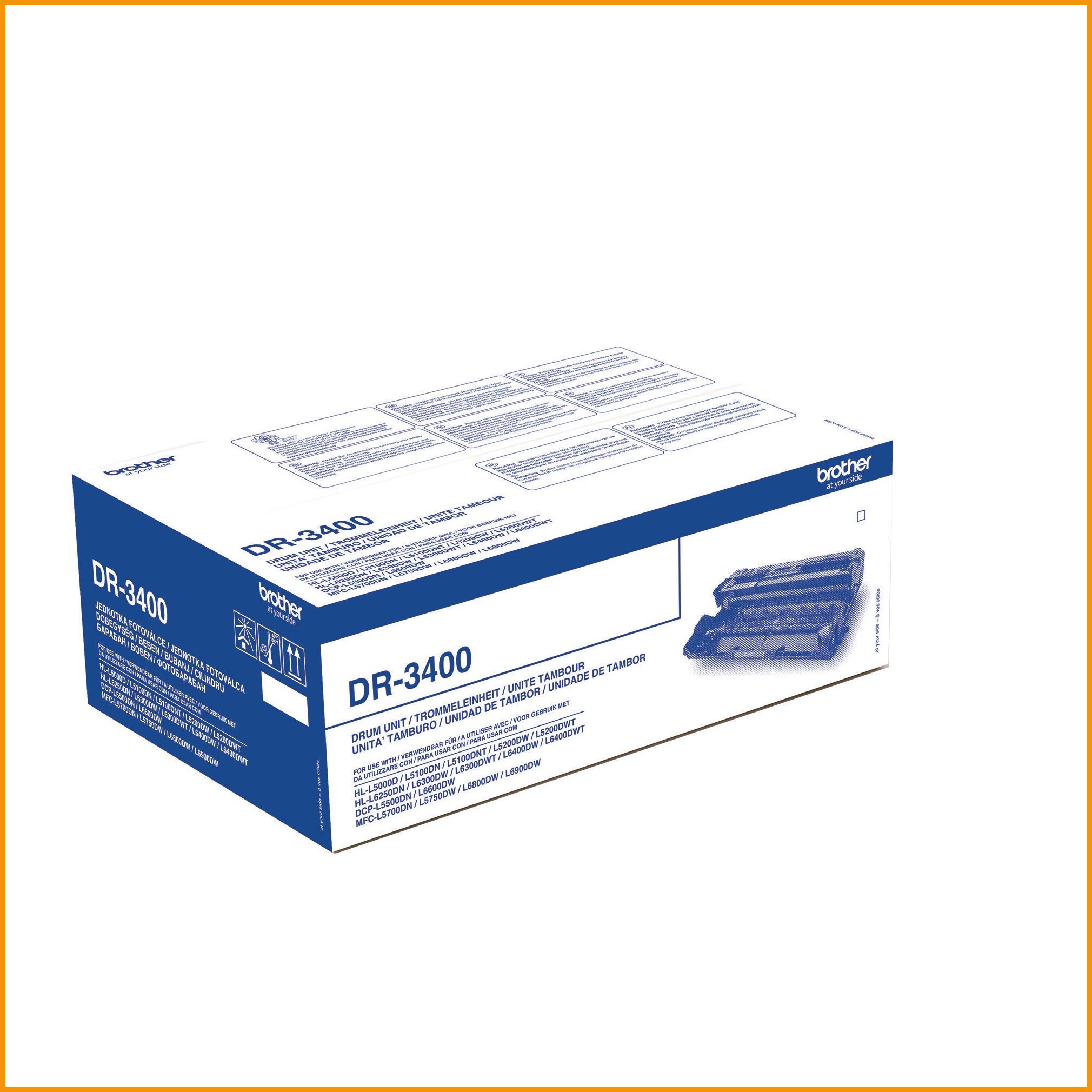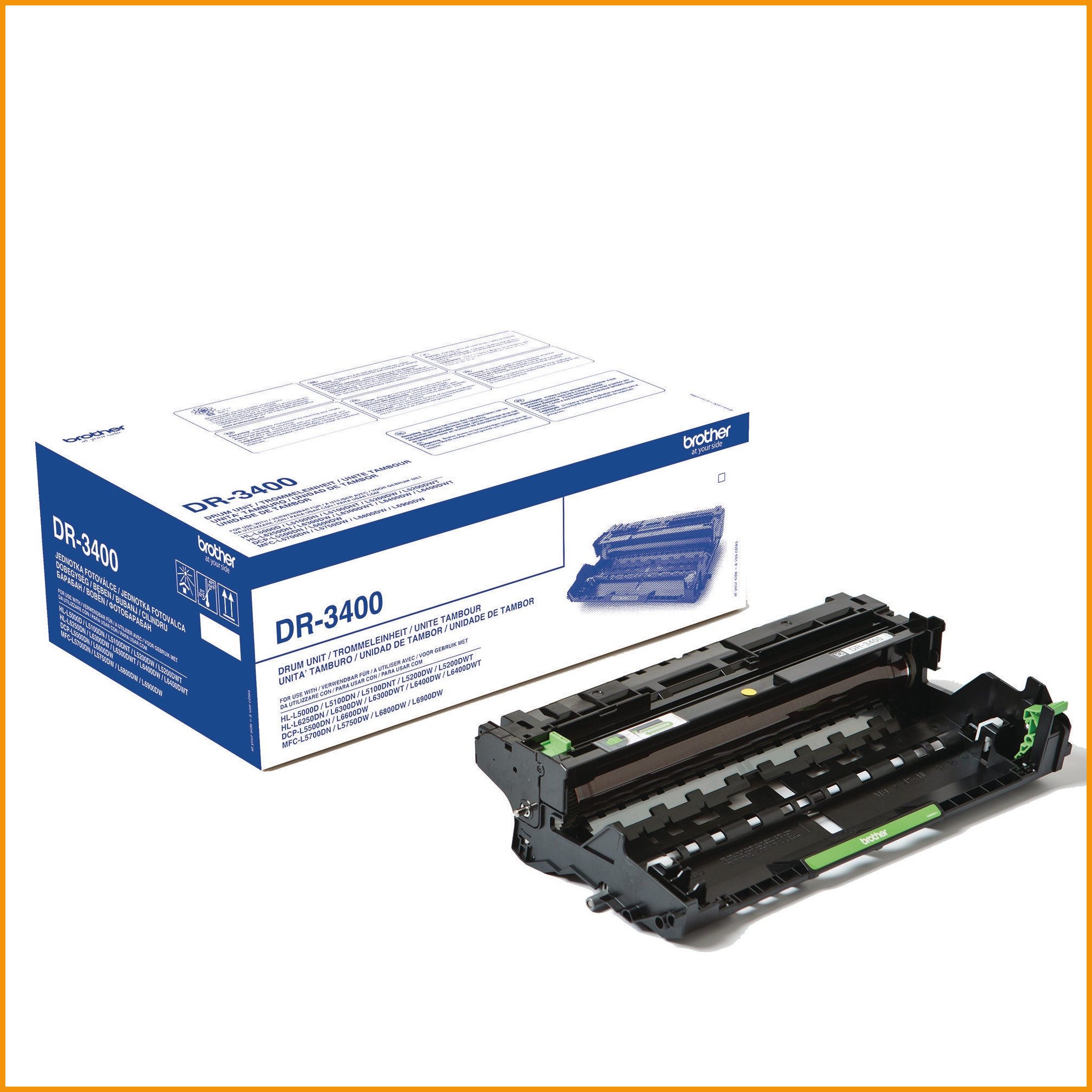 Värikasetti DR-3400 Brother tulostimeen. Taulukossa vasemmalla ovat Brother tulostimet, joihin tämä värikasetti sopii. DR-3400 värikasetti on riittoisa, sen tulostuskapasiteetti on noin 30000 sivua viiden prosentin peitolla.