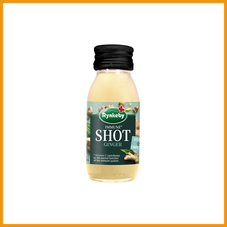 Rynkeby Shot on virkistävällä inkiväärillä tehostettu täysmehuannos, joka vahvistaa vastustuskykyä ja auttaa vähentämään väsymystä. Lisä- ja säilöntäaineettomaan shottiin ei ole lisätty sokeria.