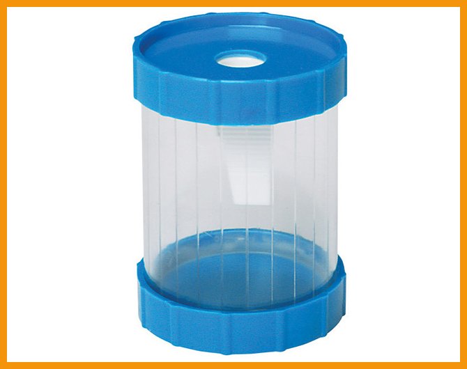 Muovinen säiliöteroitin metalliterällä. Päältä teroittava tuote sopii normaalikokoisille lyijy- ja puuvärikynille.Teroitusaukon halkaisija: 8 mm.