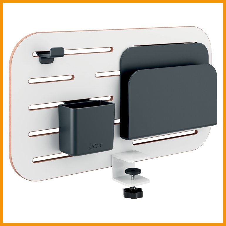 Leitz Ergo -säilytystaulun avulla pidät työpöytäsi siistinä ja hyödynnät paremmin käytettävissä olevan tilan. Pöytälevyn reunaan asennettava säilytystaulu tuo lisää säilytystilaa esimerkiksi kuulokkeille, kynille ja muistivihkolle. Säilytystaulun mukana tulee kolme 85-prosenttisesti kierrätysmuovista valmistettua säilytystarviketta (muistilehtiöpidike, kynäteline ja ripustuskoukku), jotka voit ripustaa monella eri tavalla.