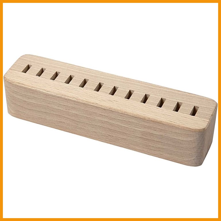 Puusta valmistettuun, tyylikkään rustiikkiseen saksitelineeseen mahtuu 12 sakset kerrallaan.Mitat: 17 x 4,3 cm.