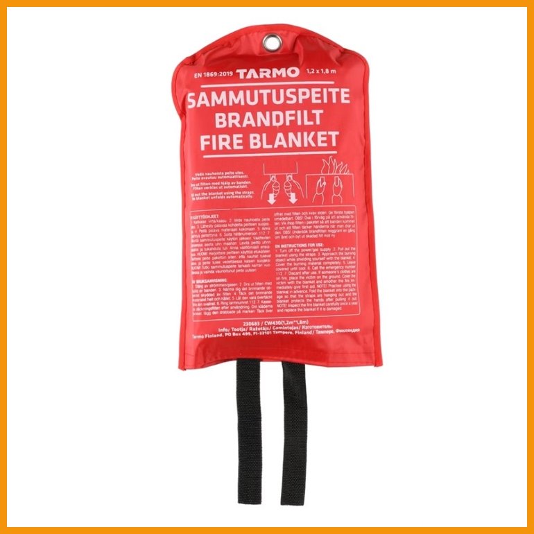 Tarmo-sammutuspeite tukahduttaa tehokkaasti pienet palot, kuten vaate- ja keittiöpalot. Sammutuspeite asetetaan paikkaan, josta sen saa tarvittaessa nopeasti käyttöön. Tuotteessa on valmis reikä ripustuskoukulle.Mitat: 120 x 180 cm