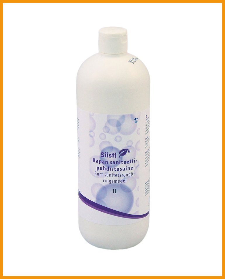 Siisti Hapan Saniteettipuhdistusaine on nimensä mukaisesti saniteettitilojen puhdistamiseen tarkoitettu pesuaine. Luonnon omista hapoista valmistettu ja hajusteeton tuote puhdistaa tehokkaasti saostumia ja likaa. Käsimenetelmiin sopiva aine soveltuu jaksottaiseen puhdistukseen kaikille vettä ja happoja sietäville pinnoille. Huom! Ei sovellu emaloiduille tai maalatuille pinnoille. Vegaaninen tuote on valmistettu 100 % uusiutuvia luonnonvaroja käyttäen.Pakkauskoko: 1 litra