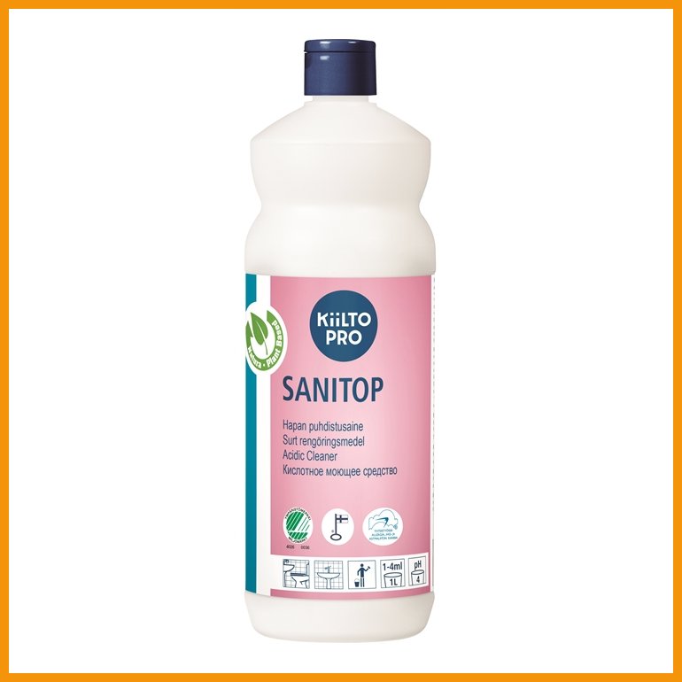 Kiilto Pro Sanitop on märkätilojen happamia pesuaineita kestävien pintojen saostumienpoistoaine, joka pysyy geelimäisen koostumuksensa ansiosta myös pystypinnoilla. Ammattikäyttöön tarkoitettua tuotetta voidaan käyttää niin vaahdotuslaitteilla, matalapainepesujärjestelmillä että käsimenetelmillä. Säännöllisesti käytettynä aine ehkäisee saostumien muodostumista.