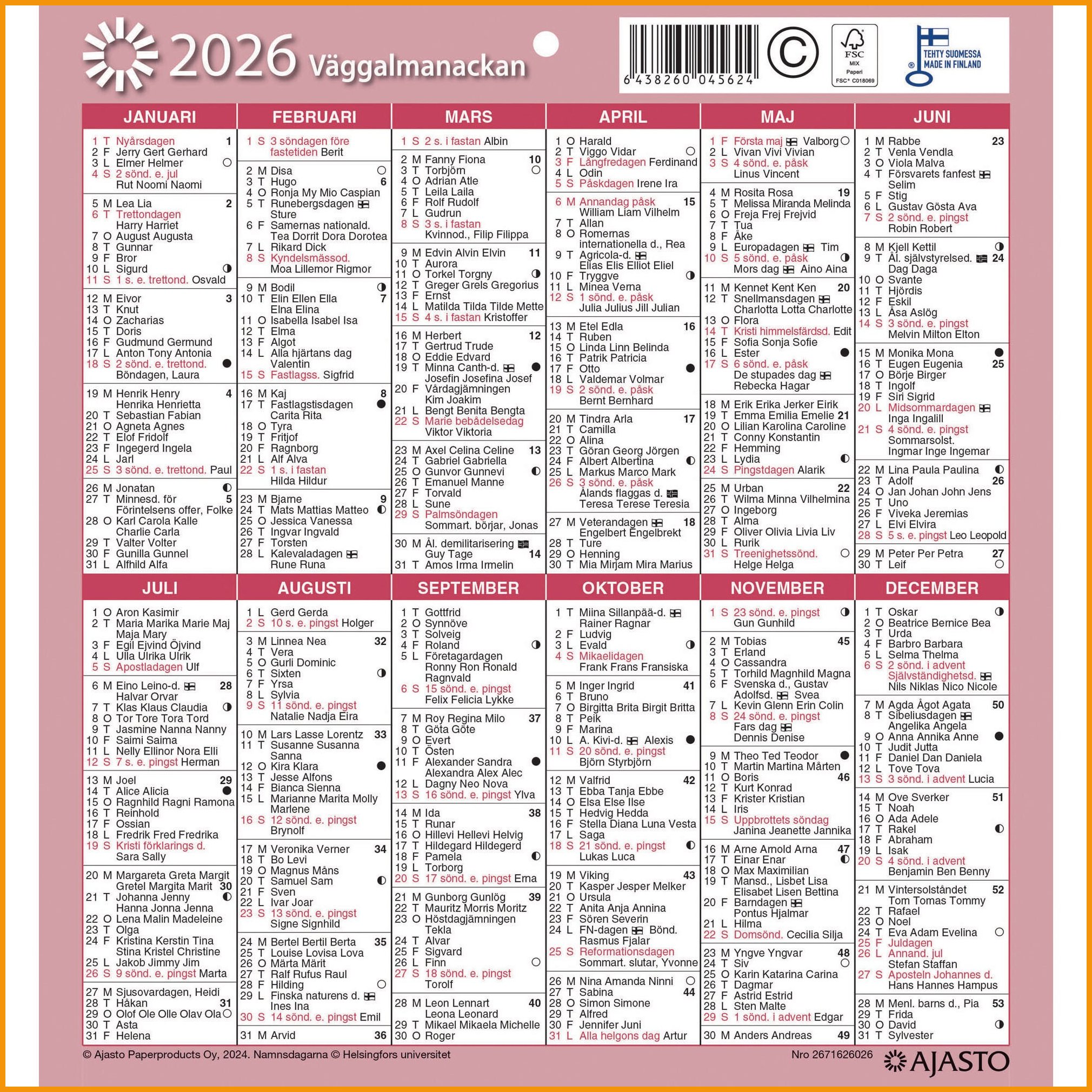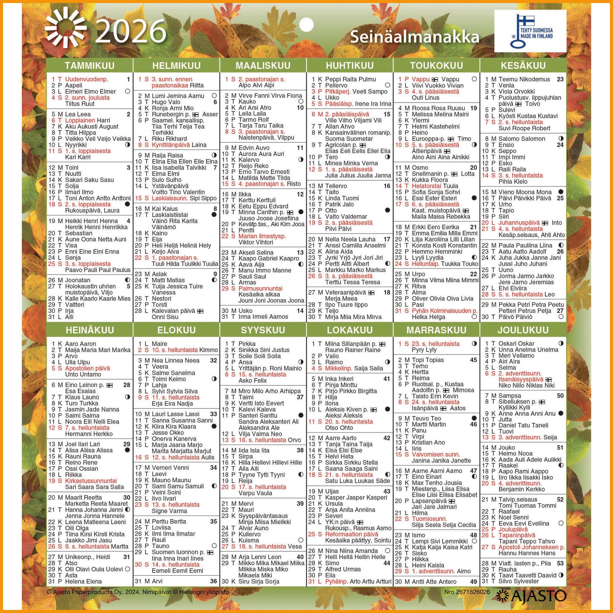 Seinäalmanakka 2026 Ajasto julistekalenteri 197 x 210mm tuotetiedot