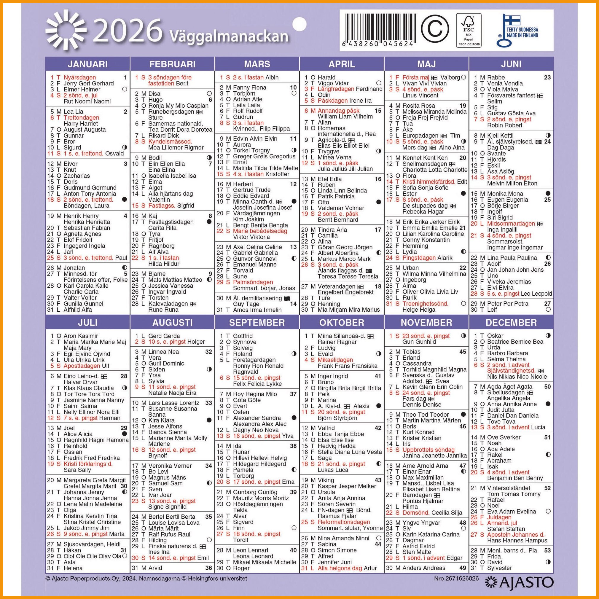 Ajasto Seinäalmanakka 2026 on suosittu seinälle ripustettava julistekalenteri. Taulukkokalenteri näyttää sivulla koko vuoden sekä runsaasti nimipäiviä. Ajasto Seinäalmanakka 2026 tärkeimmät ominaisuudet: koko 197 x 210 mm toinen puoli suomen- ja toinen ruotsinkielinen kirkkopyhät runsaasti nimipäiviä ripustusreikä värivalikoima, neljä eri vaihtoehtoa: violetti, punainen sekä kaksi kuvallista kalenteria. Väriä/ kuviota ei voi valita. kielisyys suomi ruotsi FSC®-sertifioitu tuote Ajasto-kalenterit ovat pääosin kotimaista tuotantoa. Kalentereiden suunnittelussa muiden muassa ekologisuus ja laatu ovat tärkeässä asemassa. Ajasto Seinäalmanakka 2026 julistekalenteri painetaan sertifioidulle paperille. Sertifioidulla FSC-paperilla olet mukana edistämässä vastuullista metsänhoitoa. Kalentereilla ei ole vaihto- eikä palautusoikeutta.Seinäalmanakka 2026 Ajasto julistekalenteri 197 x 210mm on hyvälaatuinen kalenteritarvike, jonka verkkokauppatilauksen toimitus perille kestää 1-2 päivää. Muistathan, että hinnaltaan yli 140 € verkkokauppatilaus toimitetaan aina ilmaiseksi! Meiltä voit tilata laskulla ja ilman rekisteröitymistä.