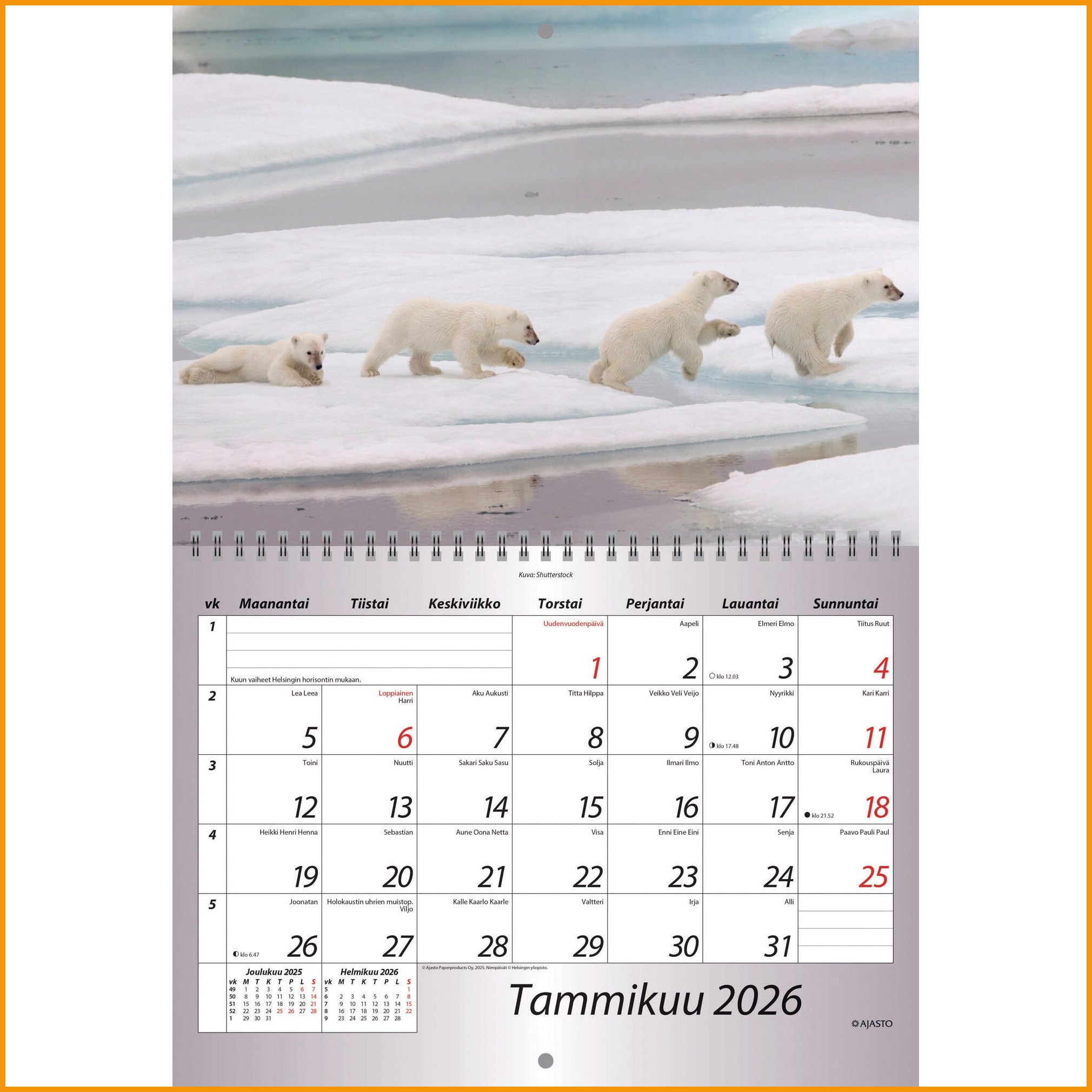 Ajasto Eläinlapset 2026 seinäkalenteri tarjoilee ihastuttavia kuvia eläinmaailman pienokaisista ympäri maailmaa. Ihastut kuviin kuukausi toisensa perään. Seinäkalenterissa on tukeva kierresidonta ja helposti luettava kuukausinäkymä. Ajasto Eläinlapset 2026 tärkeimmät ominaisuudet: koko 290 x 210 mm, avattuna 290 x 420 mm kalenteriruudukossa tilaa omille merkinnöille FSC®-serfifioitu tuote valmistettu Suomessa Ajasto-kalenterit ovat pääosin kotimaista tuotantoa. Kalentereiden suunnittelussa muiden muassa ekologisuus ja laatu ovat tärkeässä asemassa. Ajasto Eläinlapset 2026 seinäkalenteri painetaan sertifioidulle paperille. Sertifioidulla FSC-paperilla olet mukana edistämässä vastuullista metsänhoitoa. Kalentereilla ei ole vaihto- eikä palautusoikeutta.Seinäkalenteri 2026 Ajasto eläinlapset 290 x 420mm on laadukas kalenteritarvike, jonka toimituksen kesto on verkkokaupasta tilattuna 1-2 päivää. Tiedäthän, että Toimitus on ilmainen kaikilla verkkokaupan ostoksilla, joiden hinta on yli 140 €. Meiltä voit tilata laskulla ja ilman rekisteröitymistä.