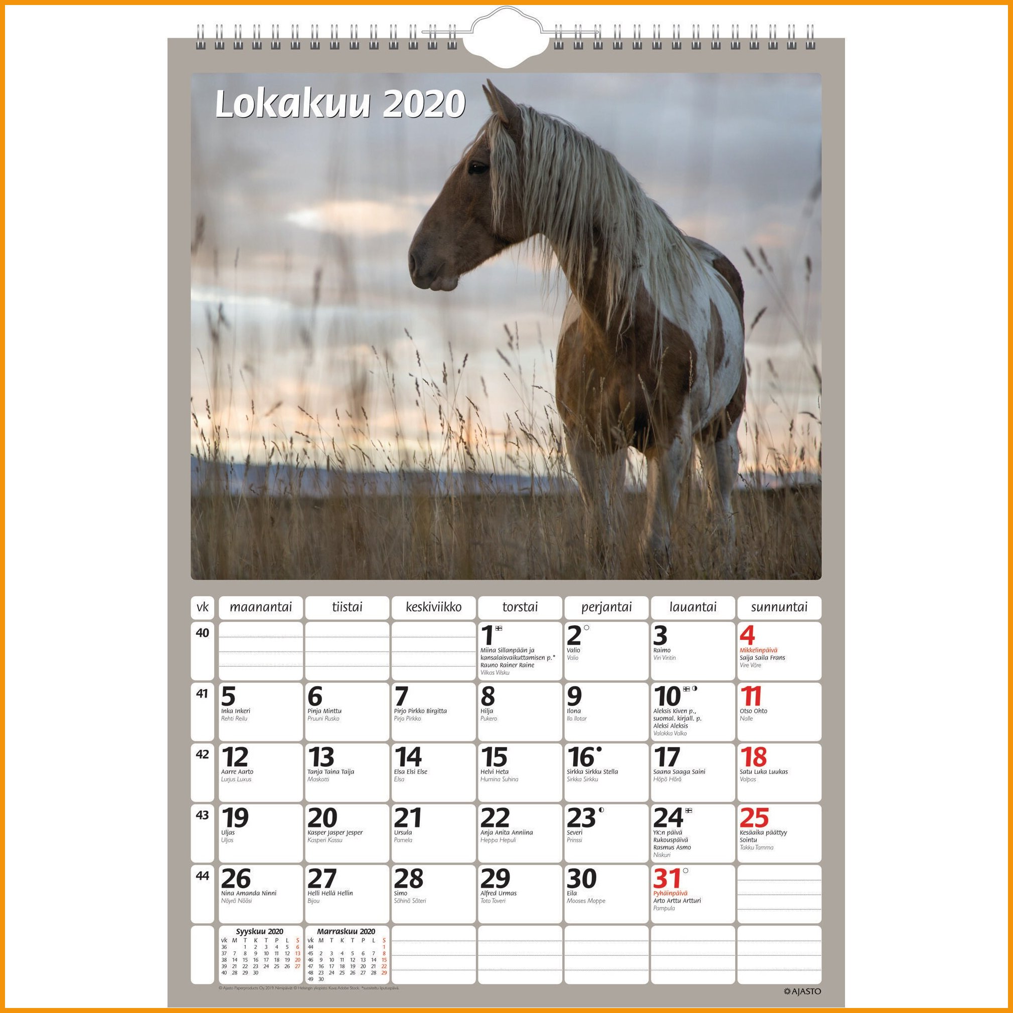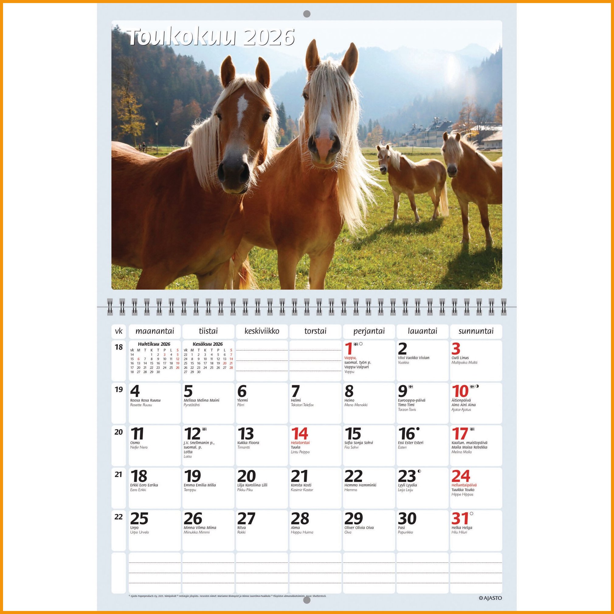 Ajasto Hevoset 2026 seinäkalenteri on täydellinen kalenteri sinulle, joka rakastat hevosia. Anna kauniiden hevoskuvien sulattaa sydämesi kuukausi toisensa jälkeen. Kalenterin erottuvassa kuukausinäkymässä on myös hevosten viralliset nimipäivät, joten et vahingossakaan unohda oman tai ystäviesi hevosten nimipäiviä. Ajasto Hevoset 2026 tärkeimmät ominaisuudet: koko 290 x 420 mm kierresidottu kalenteriruudukossa tilaa omille merkinnöille sisältää hevosten nimipäivät FSC®-sertifioitu tuote valmistettu Suomessa Ajasto-kalenterit ovat pääosin kotimaista tuotantoa. Kalentereiden suunnittelussa muiden muassa ekologisuus ja laatu ovat tärkeässä asemassa. Ajasto Hevoset 2026 seinäkalenteri painetaan sertifioidulle paperille. Sertifioidulla FSC-paperilla olet mukana edistämässä vastuullista metsänhoitoa. Kalentereilla ei ole vaihto- eikä palautusoikeutta.