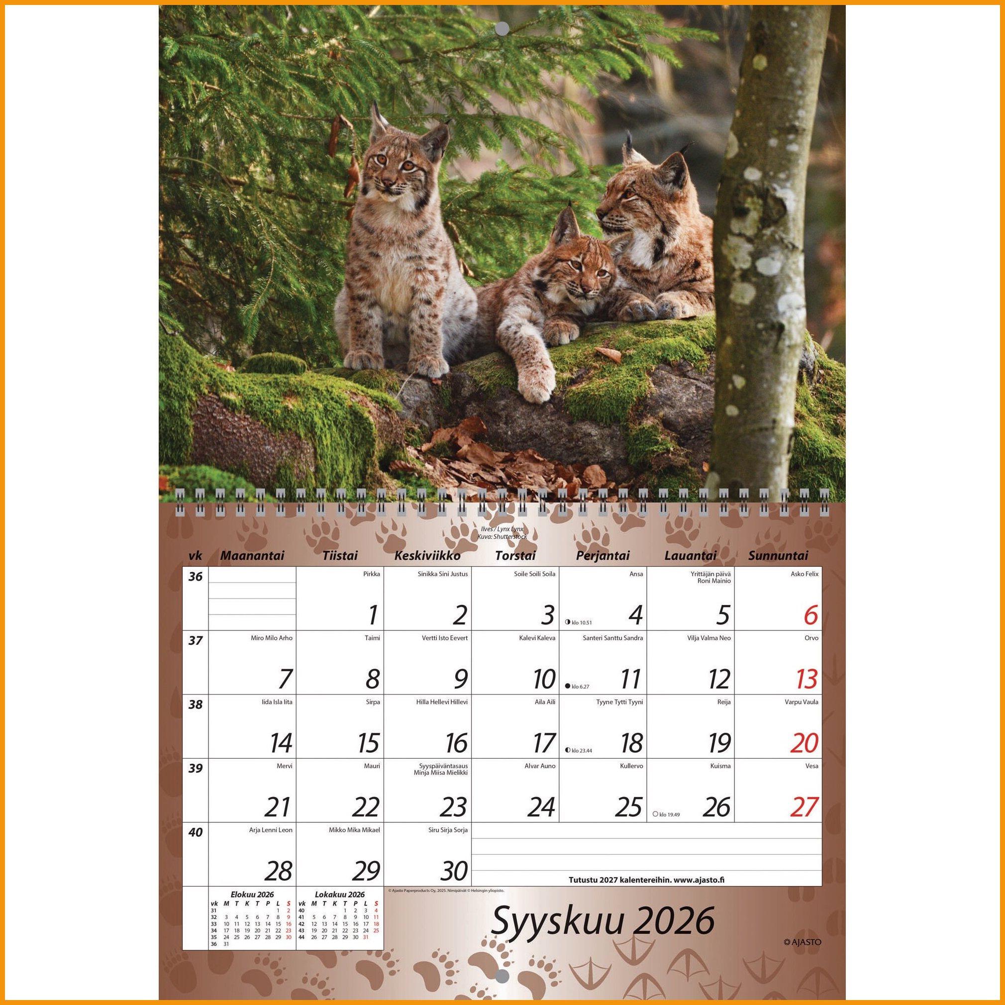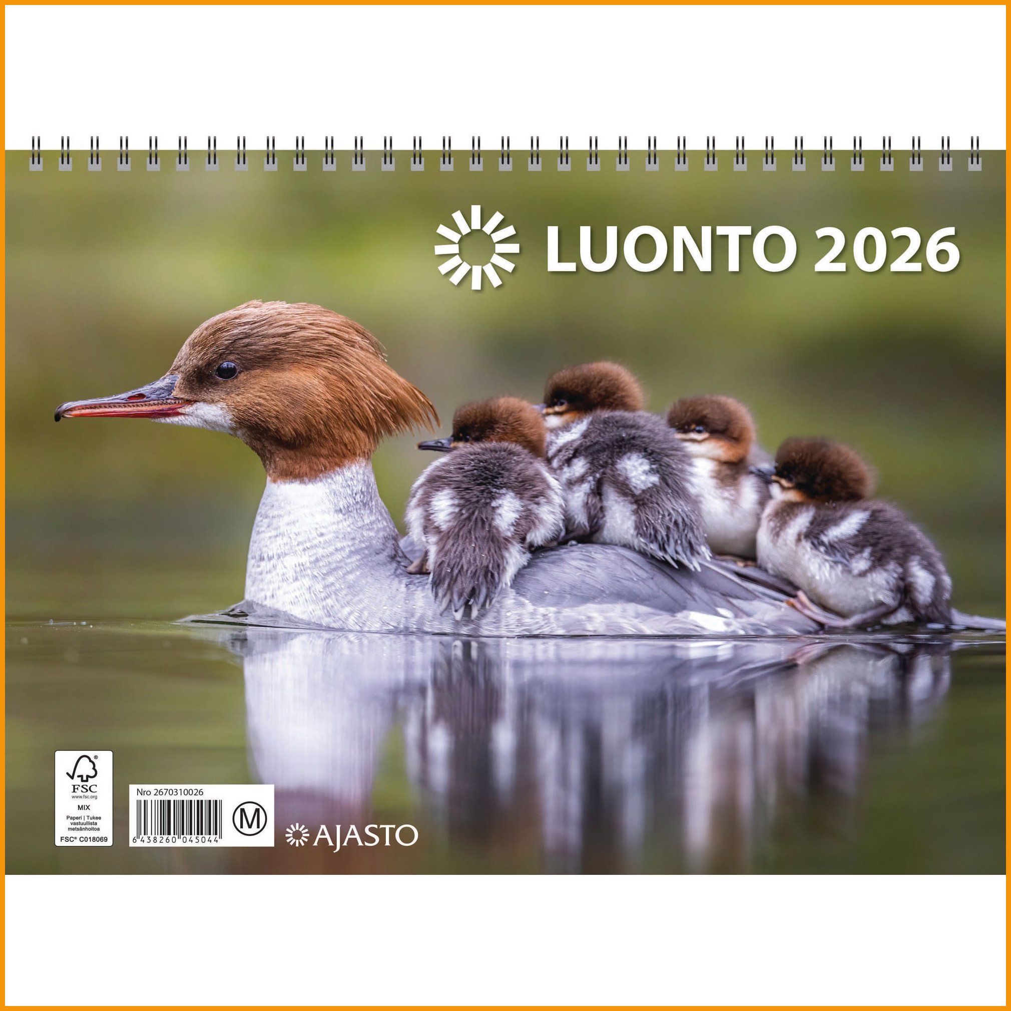 Ajasto Luonto 2026 on kaikkien luontoihmisten suosikkikalenteri. Kalenterin kauniit kuvat ovat valokuvaaja Ari Ahlforsin käsialaa. Seinälle ripustettavan kalenterin kuukausinäkymä on erottuva ja näkymään on jätetty tilaa myös omille muistiinpanoille. Ajasto Luonto 2026 tärkeimmät ominaisuudet: koko 290 x 210 mm, avattuna 290 x 420 mm kierresidottu kalenteriruudukossa tilaa omille merkinnöille FSC®-sertifioitu tuote valmistettu Suomessa Ajasto-kalenterit ovat pääosin kotimaista tuotantoa. Kalentereiden suunnittelussa muiden muassa ekologisuus ja laatu ovat tärkeässä asemassa. Ajasto Luonto 2026 seinäkalenteri painetaan sertifioidulle paperille. Sertifioidulla FSC-paperilla olet mukana edistämässä vastuullista metsänhoitoa. Kalentereilla ei ole vaihto- eikä palautusoikeutta.Seinäkalenteri 2026 Ajasto luonto 290 x 420mm on hyvälaatuinen kalenteritarvike, jonka verkkokaupan tilauksen toimitus kestää 1-2 päivää. Muistathan, että toimitus on ilmainen yli 140 € hintaisille verkkokauppa ostoksille! Meiltä voit tilata laskulla ja ilman rekisteröitymistä.