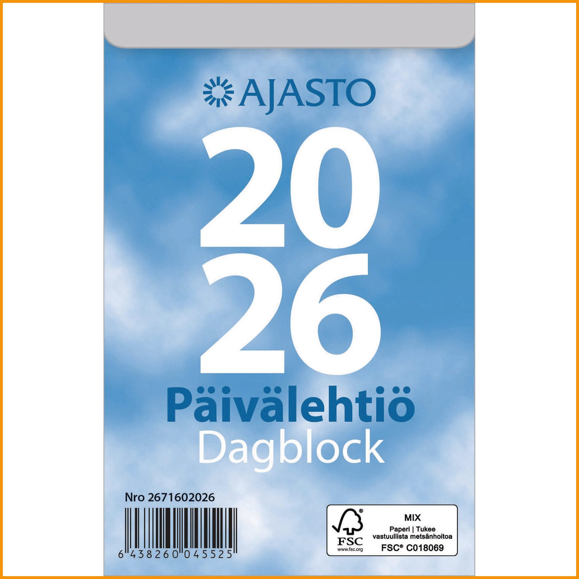 Ajasto Päivälehtiö 2026 seinäkalenteri kannustaa ottamaan päivän kerrallaan. Seinälle ripustettava Päivälehtiö näyttää kuluvan päivän suurin numeroin ja päivän vaihtuessa vanha sivu repäistään irti. Lehtiössä on tukeva metallikiinnitys taustaan. Ajasto Päivälehtiö 2026 tärkeimmät ominaisuudet: koko 83 x 128 mm kalenterilehtiö seinälle metallikiinnitys taustaan irti repäistävä lehti jokaiselle päivälle suomalaiset ja suomenruotsalaiset nimi- ja juhlapäivät FSC®-sertifioitu tuote Ajasto-kalenterit ovat pääosin kotimaista tuotantoa. Kalentereiden suunnittelussa muiden muassa ekologisuus ja laatu ovat tärkeässä asemassa. Ajasto Päivälehtiö 2026 seinäkalenteri painetaan sertifioidulle paperille. Sertifioidulla FSC-paperilla olet mukana edistämässä vastuullista metsänhoitoa. Kalentereilla ei ole vaihto- eikä palautusoikeutta.Seinäkalenteri 2026 Ajasto päivälehtiö 83 x 128mm on mainio kalenteritarvike, jonka verkkokauppatilauksen toimitus perille kestää 1-2 päivää. Huomaa, että hinnaltaan yli 140 € verkkokauppatilaus toimitetaan aina ilmaiseksi! Meiltä voit tilata laskulla ja ilman rekisteröitymistä.