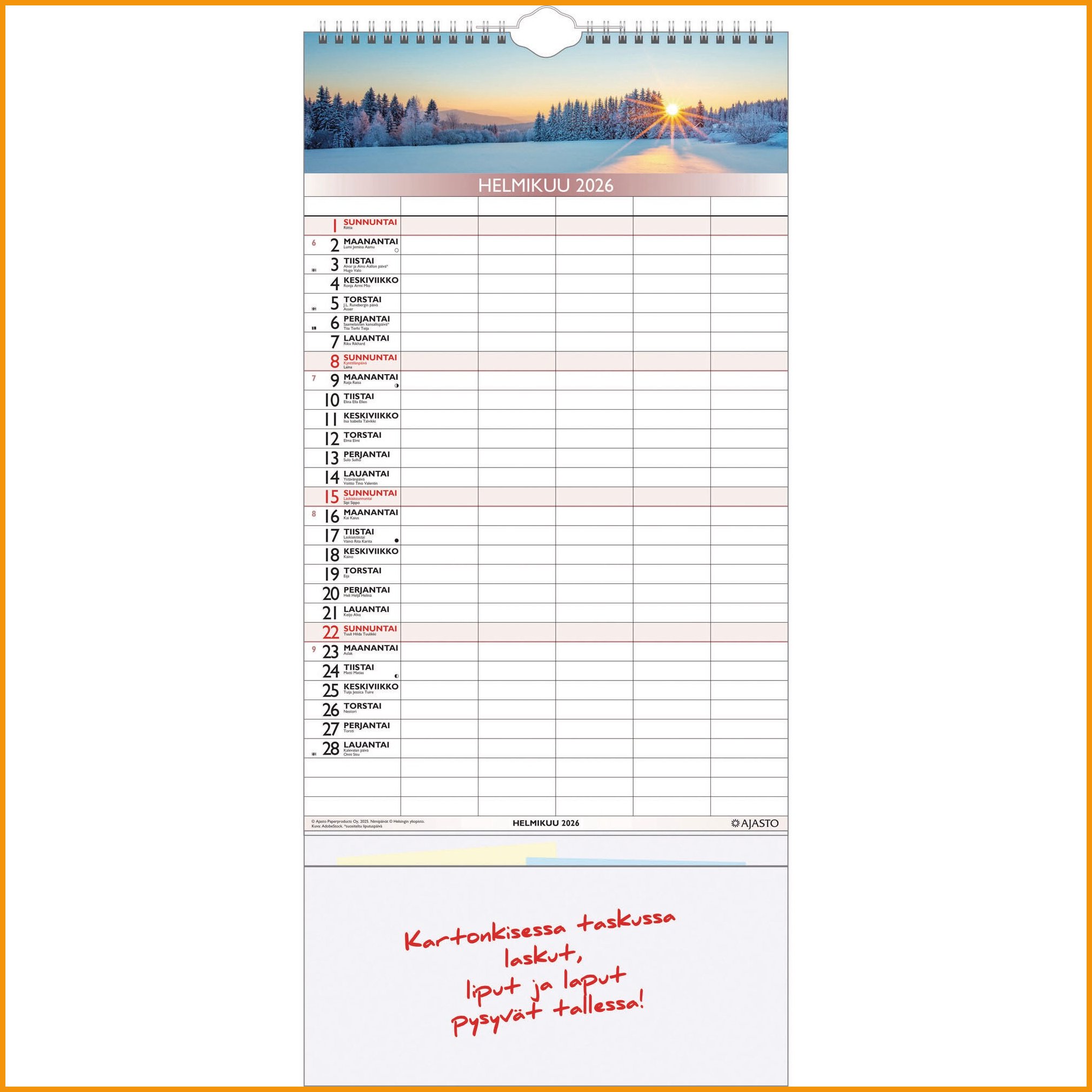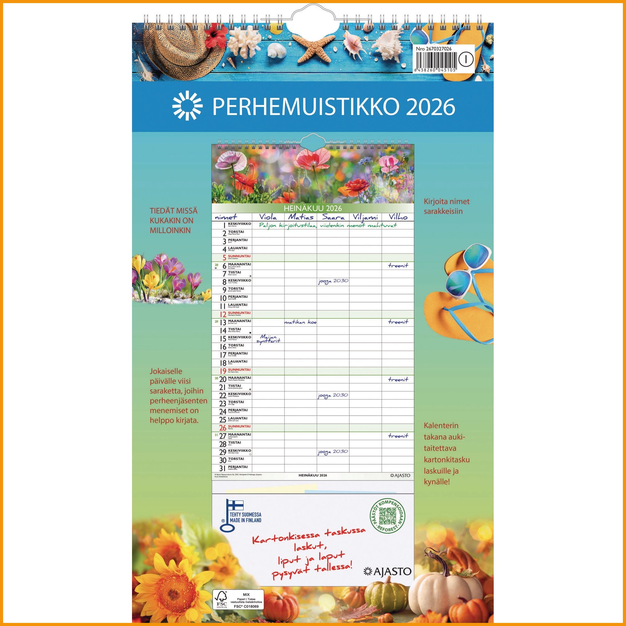 Ajasto Perhemuistikko 2026 seinäkalenteri helpottaa sinun ja perheesi arkea. Jo yhdellä silmäyksellä näet koko perheen menemiset ja tulemiset. Kirjoita kaikkien nimet kalenteriosan ylhäältä löytyviin sarakkeisiin ja lisää menot allekkaisille riveille oikean päivän kohdalle. Helppoa ja nopeaa. Kalenterissa on tukeva kierresidonta ja ripustuskoukku sekä takana muovitasku esimerkiksi laskujen säilyttämiseen. Ajasto Perhemuistikko 2026 tärkeimmät ominaisuudet: koko 250 x 415 mm jokaiselle päivälle viisi saraketta kätevä muovitasku laskuille ja kynälle FSC®-sertifioitu tuote valmistettu Suomessa Ajasto-kalenterit ovat pääosin kotimaista tuotantoa. Kalentereiden suunnittelussa muiden muassa ekologisuus ja laatu ovat tärkeässä asemassa. Ajasto Perhemuistikko 2026 seinäkalenteri painetaan sertifioidulle paperille. Sertifioidulla FSC-paperilla olet mukana edistämässä vastuullista metsänhoitoa. Kalentereilla ei ole vaihto- eikä palautusoikeutta.Seinäkalenteri 2026 Ajasto perhemuistikko 250 x 415mm on hyvä kalenteritarvike, jonka verkkokauppatilauksen toimitus perille kestää 1-2 päivää. Tiedäthän, että Toimitus on ilmainen kaikilla verkkokaupan ostoksilla, joiden hinta on yli 140 €. Meiltä voit tilata laskulla ja ilman rekisteröitymistä.