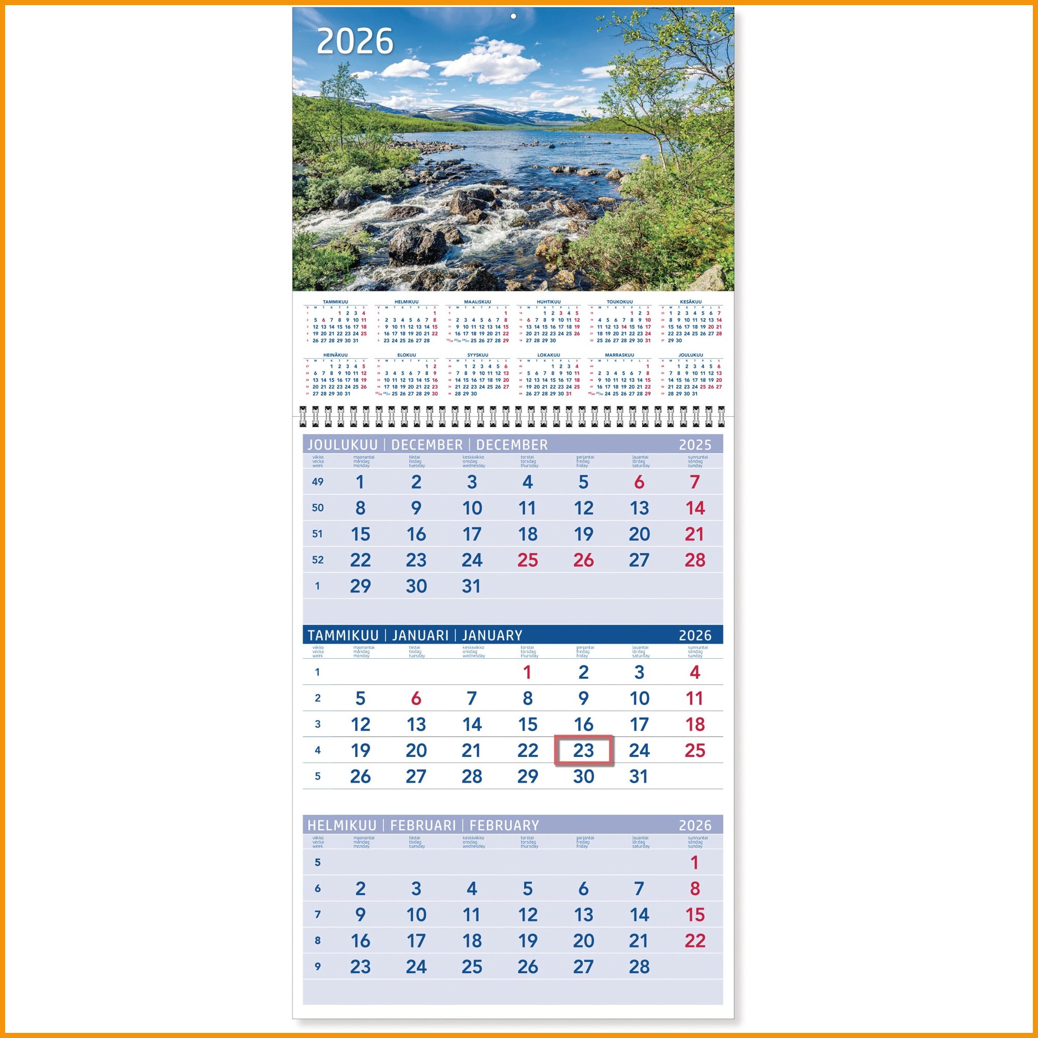 Hinta 28,23€ / kplAjasto Trio 2026 seinäkalenteri piristää päivääsi kauniilla luontokuvilla, joita on tarjolla jokaiselle kuukaudelle. Kalenteriosassa Trio 2026 näyttää kolmen kuukauden näkymän - edellinen, kuluva ja seuraava kuukausi. Päivien numerointi on selkeä ja erottuva. Kuukausittaisen luontokuvan ...VarastossaTarkastele- +