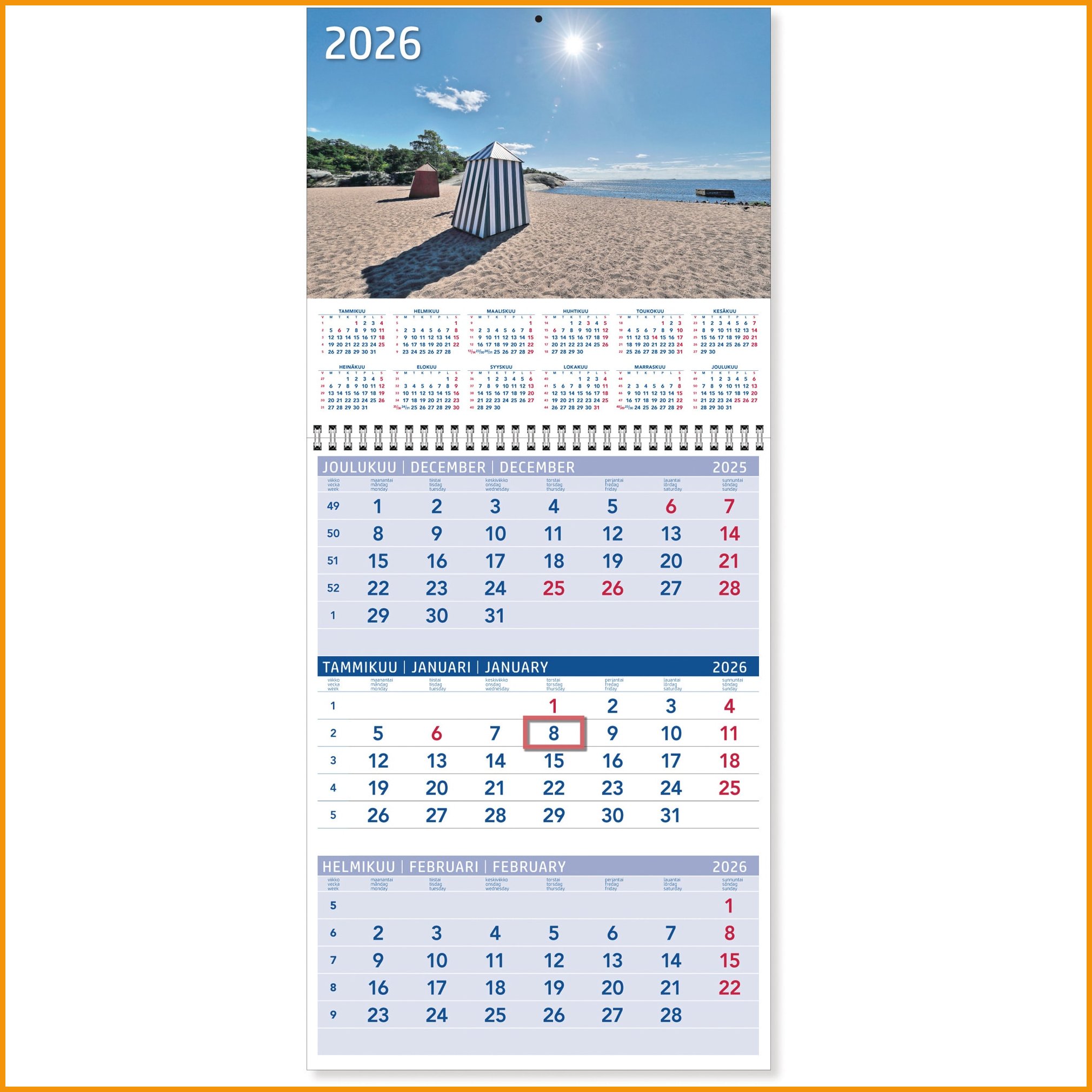 CC 5116 Triplanner Pieni 2026 – käytännöllinen seinäkalenteri kolmella kuukaudella CC 5116 Triplanner Pieni 2026 seinäkalenteri on kompakti ja käytännöllinen ratkaisu ajanhallintaan niin kotiin, toimistoon kuin lahjaksi. Kalenteri näyttää aina kerralla kolme kuukautta: edellisen, kuluvan ja seuraavan. Kuluva kuukausi on selkeästi korostettu vaalealla pohjalla, mikä tekee päivien seuraamisesta helppoa. Mukana oleva siirrettävä päivämääräosoitin auttaa hahmottamaan arjen aikatauluja päiväkohtaisesti. Avattuna kalenterin koko on 232 x 535 mm. Kalenteri ripustetaan seinälle kuvaosan valmiista ripustusreiästä, ja kuvaosan alaosasta löytyy koko vuoden taulukkokalenteri, joka tarjoaa kätevän yleisnäkymän. Triplanner Pieni 2026 on kierresidottu, mikä tekee sivujen kääntämisestä sujuvaa ja lisää käytettävyyttä. Kalenterissa on tekstit suomeksi, ruotsiksi ja englanniksi, joten se sopii monikielisiin ympäristöihin. Lisäksi Triplanner Pieni 2026 on erinomainen liikelahja, sillä kalenteriin voidaan painattaa yrityksen logo tai käyttää yrityksenne omia kuvia. Näin se tarjoaa näkyvyyttä ja hyödyllisen työkalun koko vuoden ajaksi. Tilaa Triplanner Pieni 2026 kalenteri verkkokaupasta ja varmista, että arjen suunnittelu pysyy selkeänä ja hallittuna. Tämä vuoden 2026 kalenteri on kompakti mutta monipuolinen ratkaisu kaikille, jotka haluavat pysyä ajan tasalla koko vuoden. Huomioithan, että kalentereilla ei ole vaihto- eikä palautusoikeutta.Seinäkalenteri 2026 Cc 5116 triplanner pieni 232 x 535mm on tasokas kalenteritarvike, jonka verkkokauppatilauksen toimitus perille kestää 1-2 päivää. Huomaa, että hinnaltaan yli 140 € verkkokauppatilaus toimitetaan aina ilmaiseksi! Meiltä voit tilata laskulla ja ilman rekisteröitymistä.