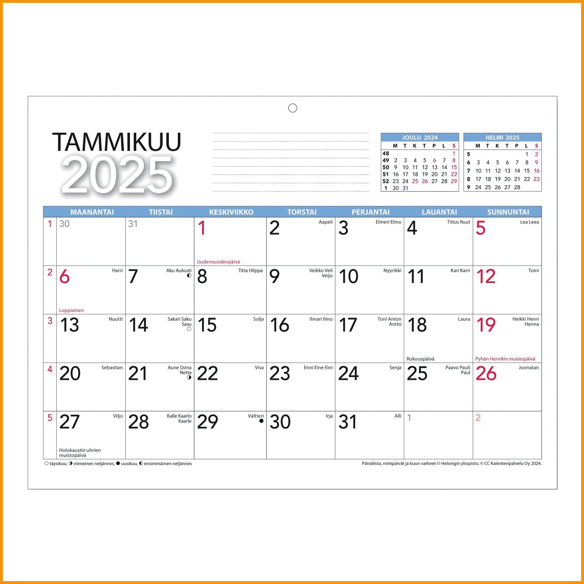 Korkealaatuiset toimistotarvikkeet yrityksille, yhdistyksille, valtion ja kuntien toimipaikoille. Kotimainen, edullinen nettikauppa on helppokäyttöinen ja kaikki seinäkalenterit 2026 toimitetaan halpaan hintaan nopeasti. Verkkokaupastamme tilaat tarvikkeet toimistoon helposti rekisteröitymättä!Tilaa 5353057 seinäkalenteri verkkokaupasta!