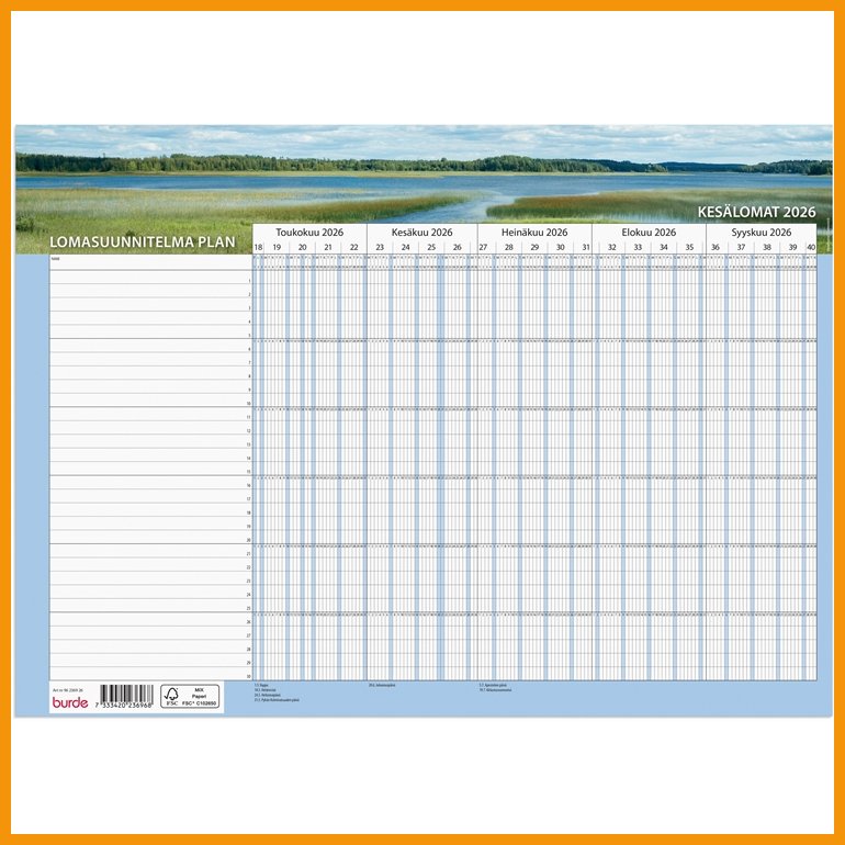 Seinäkalenteri 2026 Lomasuunnitelma Plan on tasokas kalenteritarvike, jonka verkkokauppatilauksen toimitus perille kestää 1-2 päivää. Huomaa, että toimitus on ilmainen yli 140 € hintaisille verkkokauppa ostoksille! Meiltä voit tilata laskulla ja ilman rekisteröitymistä.