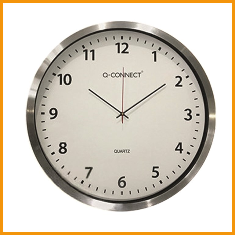 Q-Connectin pyöreässä seinäkellossa on mustat numerot valkoisella taululla ja krominvärisillä kehyksillä. Analoginen kello toimii yhdellä AA-paristolla (ei mukana pakkauksessa).Halkaisija: 60 cm