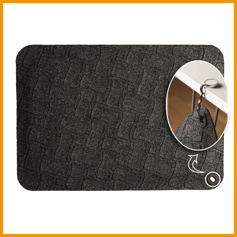 ErgoFinlandin Työpistematto on suunniteltu ehkäisemään selkäongelmia ja jalkojen kipuja mm. keventämällä alaselän kuormitusta ja vaimentamalla niveliin kohdistuvaa rasitusta. Jalkapohjan alla miellyttävän tuntuisessa matossa on tyylikäs ja pehmeä kangaspinta, luistamaton pohja, ripustusreikä ja kompastumista ehkäisevät viistetyt reunat.Mitat: 55 x 78 x 1,8 cm