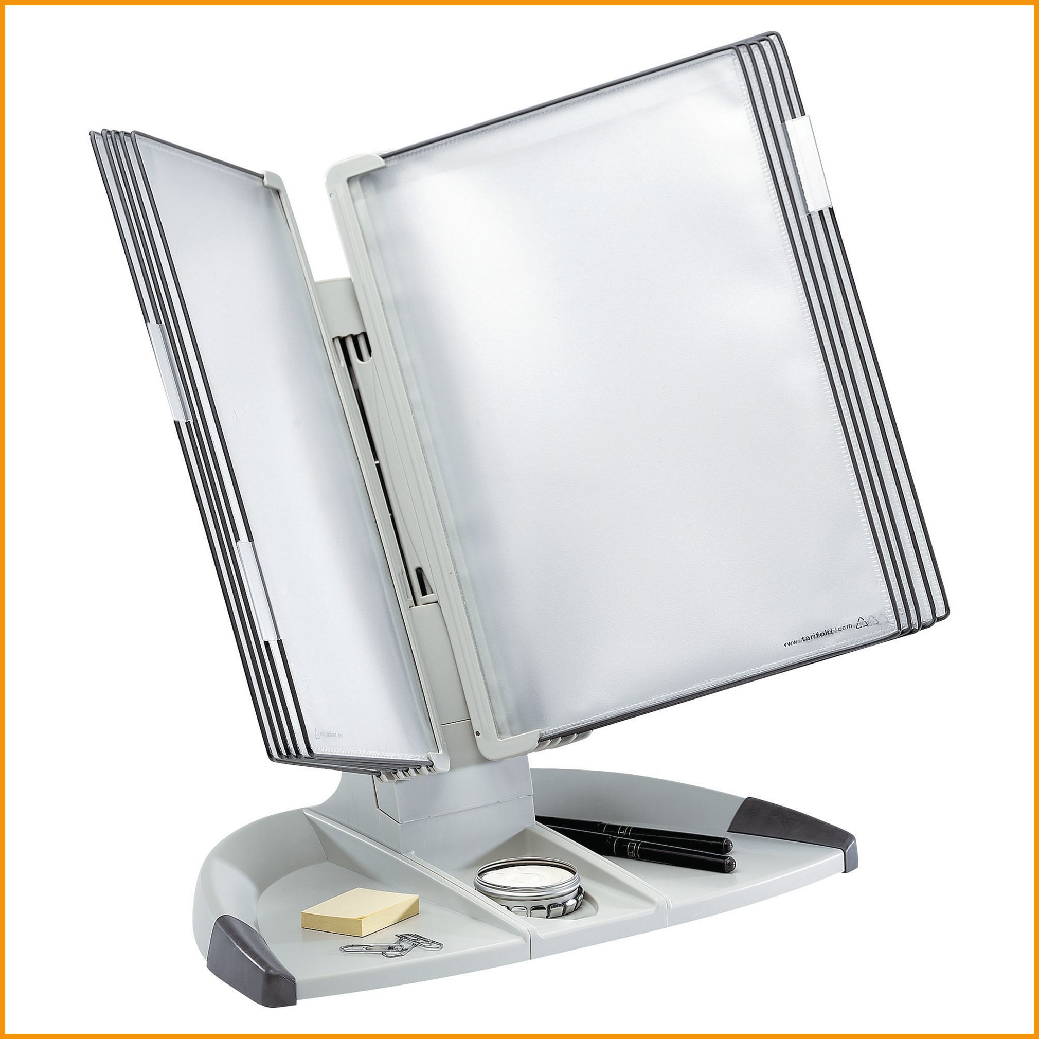 Selailuteline Tarifold T-Office harmaa A4 on laadukas selailuteline A4 dokumenteille. Tarifold T-Office selailutelineessä on mukana 10 taskua. Selailutelineen jalustassa on kolme tarvikelokeroa ja siihen voi lisätä lisätaskuja. Katso myös muita pöytätelineitä verkkokaupasta.