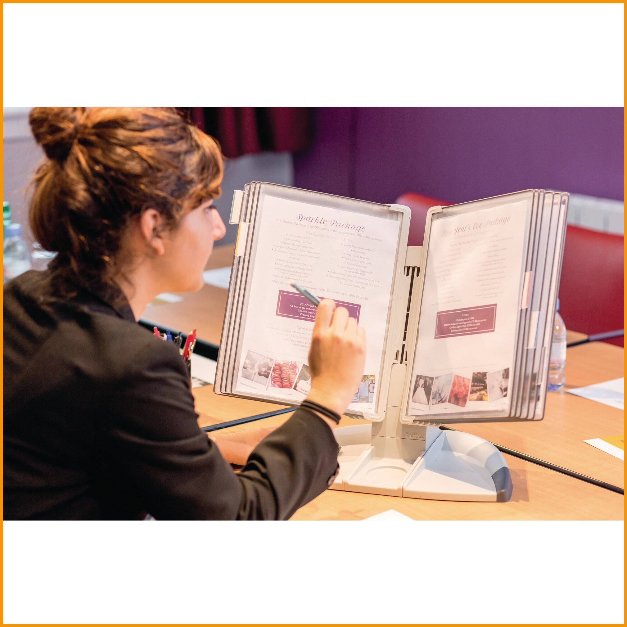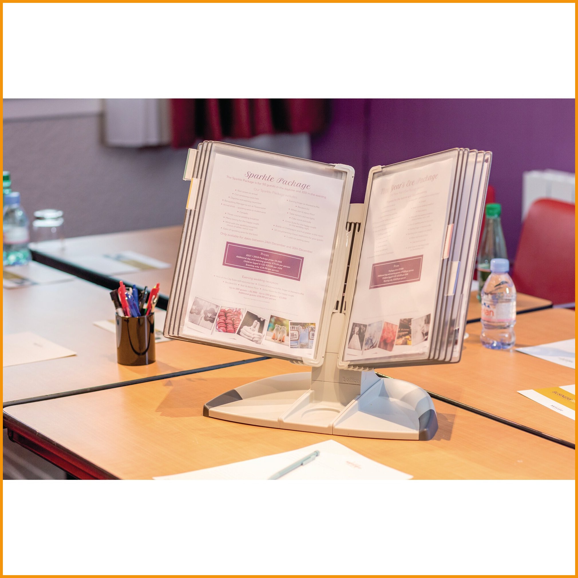 Hinta 73,77€ / kplTukeva tarifold -pöytäteline helpottaa ja nopeuttaa tiedonhakua. vaaleanharmaa metallijalusta on juuri oikeassa katselukulmassa. kaksi sivupysäytintä tukee taskuja ja rajoittaa avauskulmaa. teline toimitetaan värikkäiden a4-taskujen kanssa.