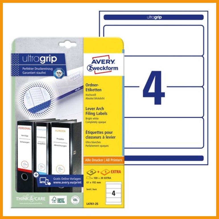 Averyn selkäetiketit soveltuvat niin kopiointiin kuin sekä laser- että mustesuihkutulostukseenkin ilman tukoksia tai mustetahroja. Etenkin leveiden mappien selkämyksiin istuvissa tarroissa on tulostuksen laatua parantava Ultragrip-pinnoitus.
