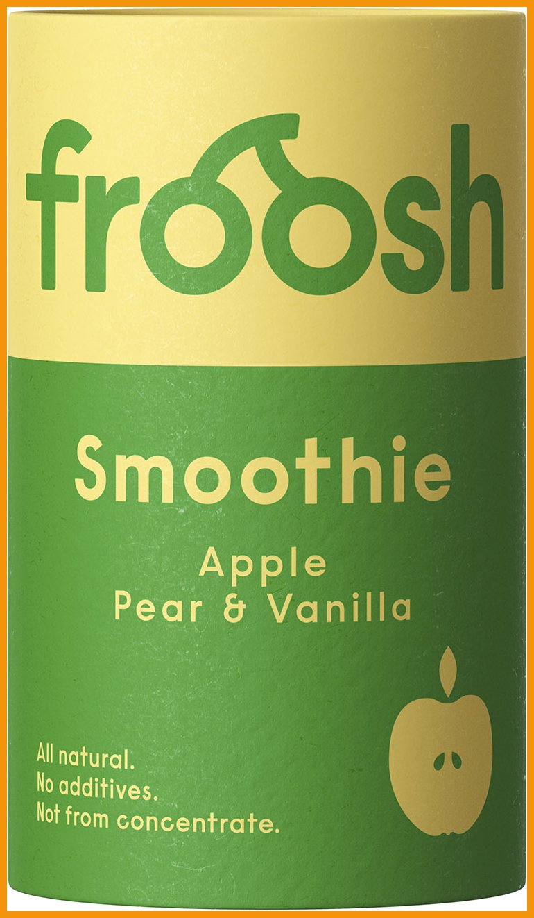 Froosh Smoothie on helppo, terveellinen ja hyvänmakuinen välipala. Omenan, päärynän ja vaniljan maut hivelevät makuhermoja ilman lisäaineita tai lisättyä sokeria.Sisältö: 150 ml.